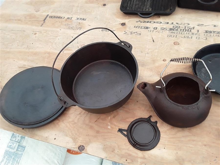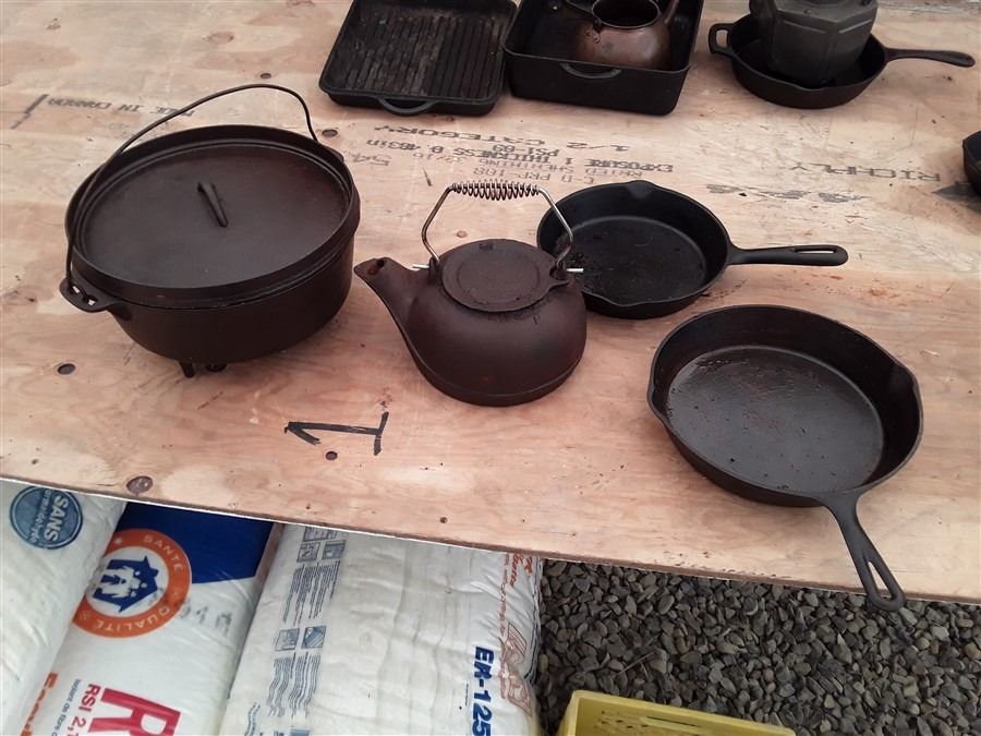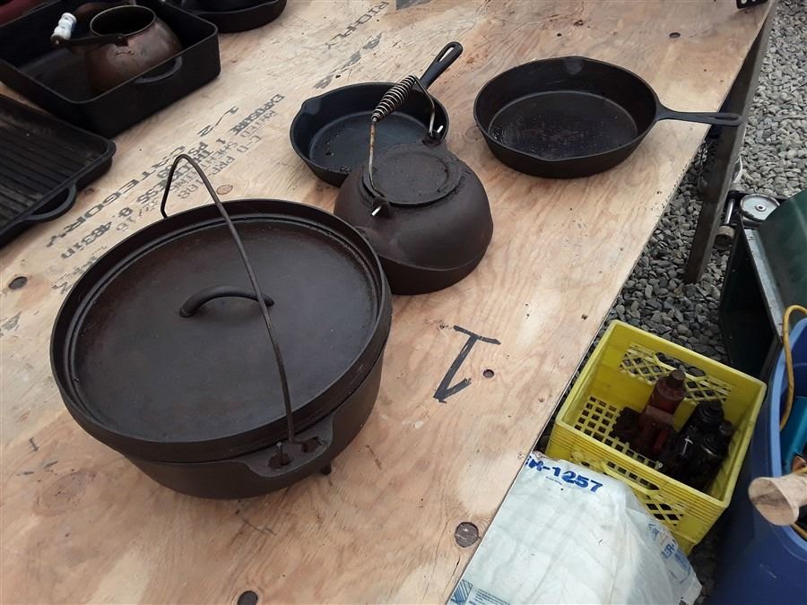 Lot of cast Iron - 2 Skillets, kettle & pot with Lid - Storage Locker Clean Out - 17% Buyer Fee. Payment Processed through Live Auction World ( Visa or Master Card ) pick up Saturday, or Tuesday