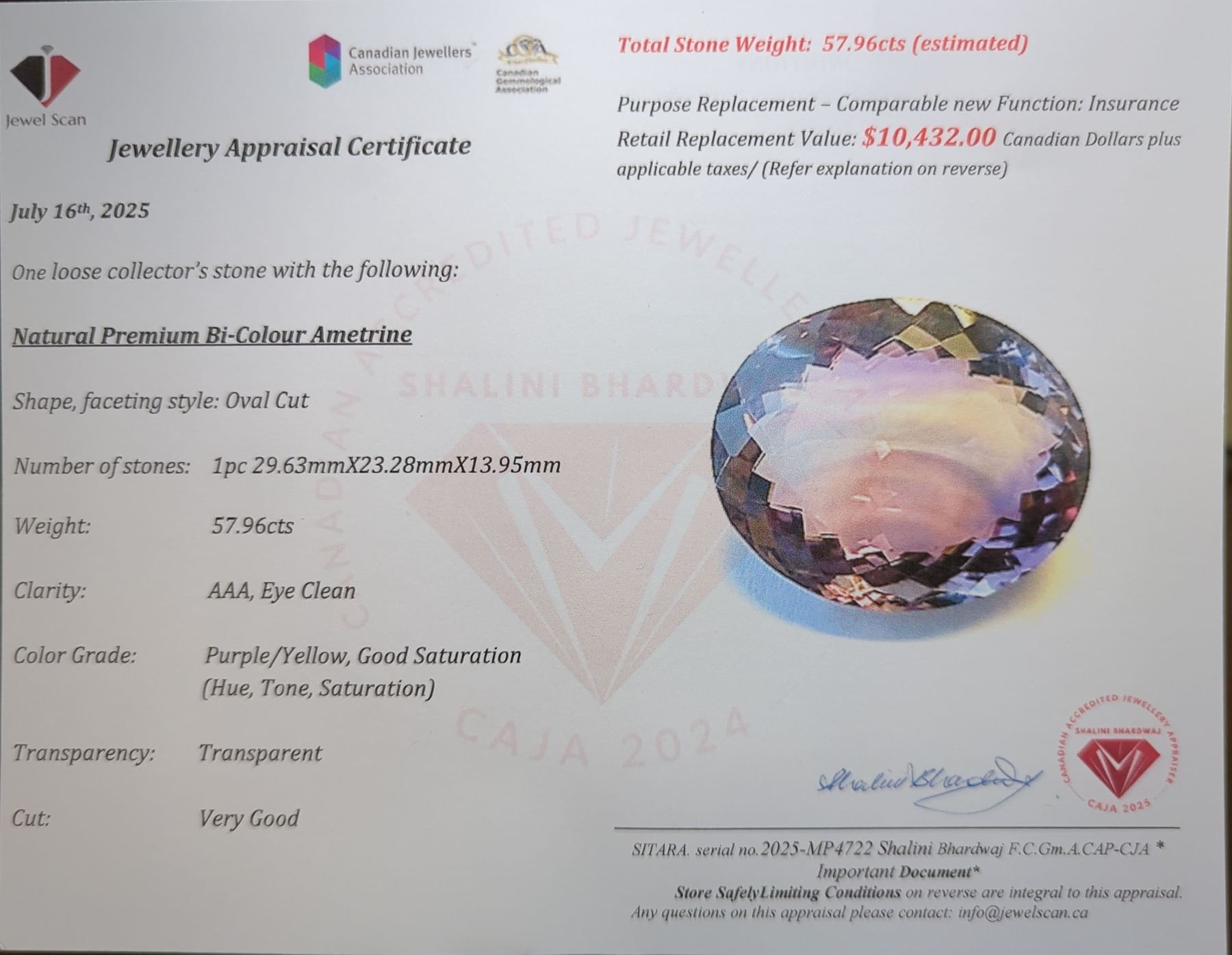 57.96 CT CERTIFIED BI-COLOUR AMETRINE GEMSTONE ($10,432 APPRAISAL, APPRAISAL NOT GUARANTEED)
