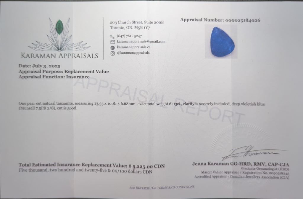 6.03 CT CERTIFIED TANZANITE GEMSTONE ($5,225 APPRAISAL)