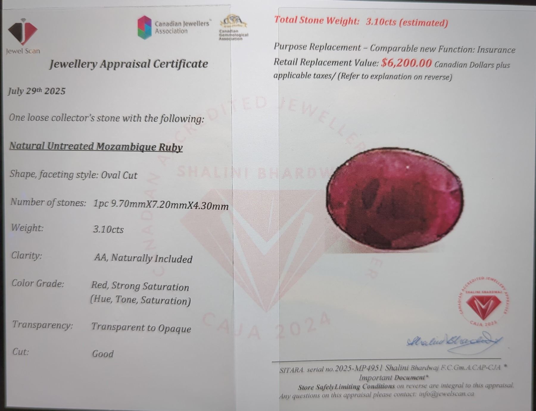 $6,200 Appraisal - 3.1 ct Cert. Red Ruby Gemstone