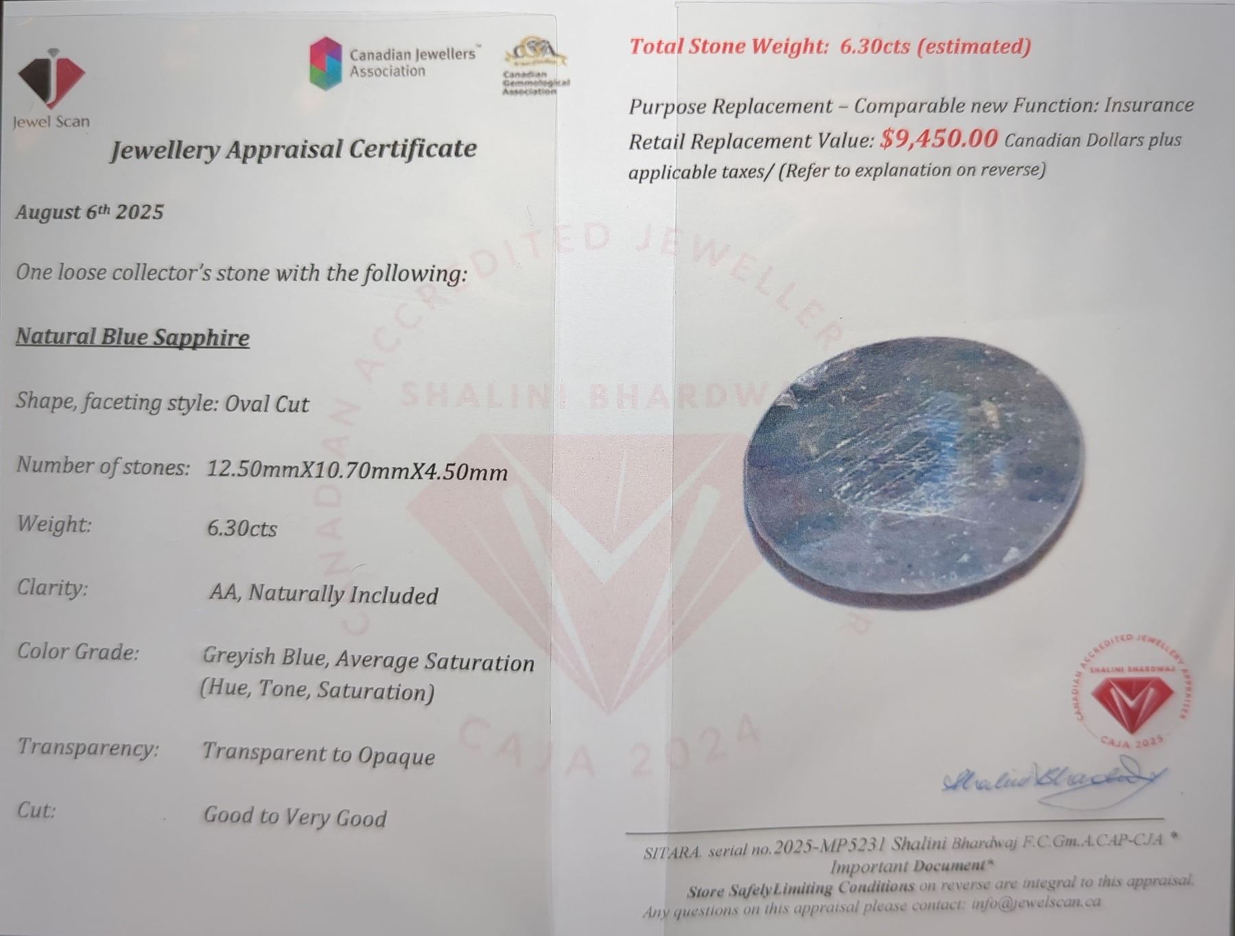 6.3 ct Certified Blue Sapphire gemstone ($9,450 Appraisal)