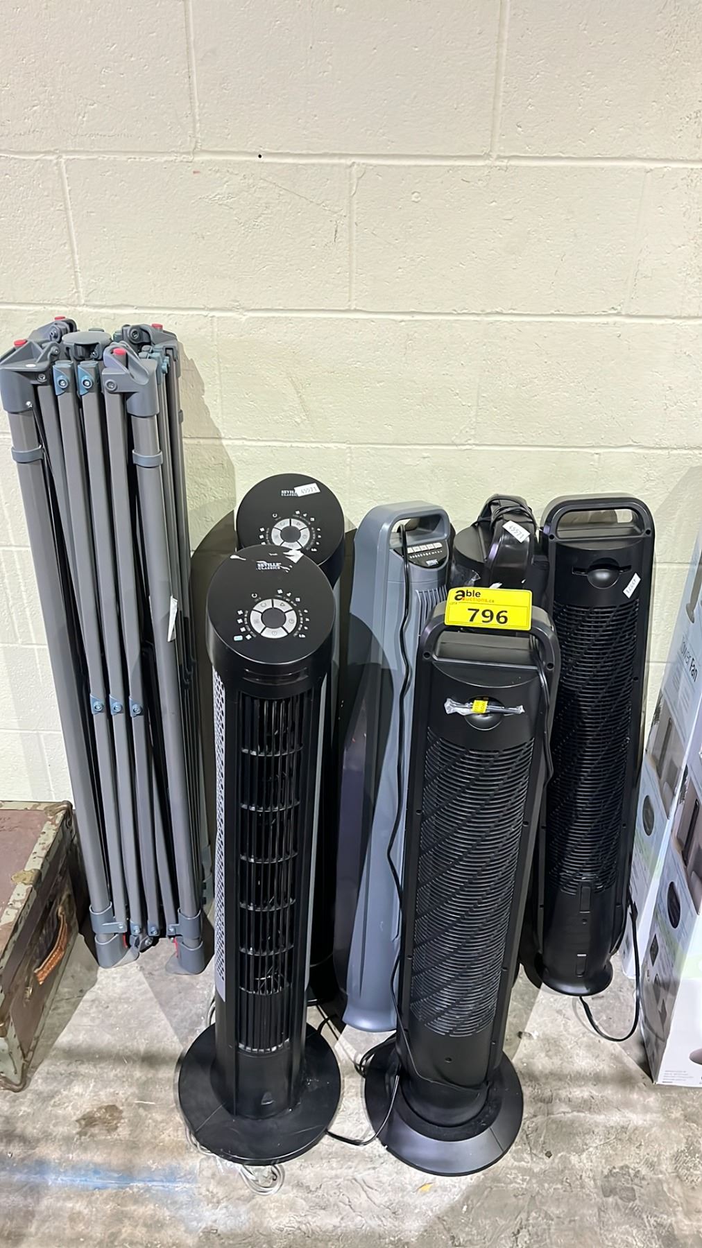 6 ASSORTED TOWER FANS & POP-UP GAZEBO FRAME (UNKNOWN WORKING CONDITION, MAY BE MISSING PIECES)