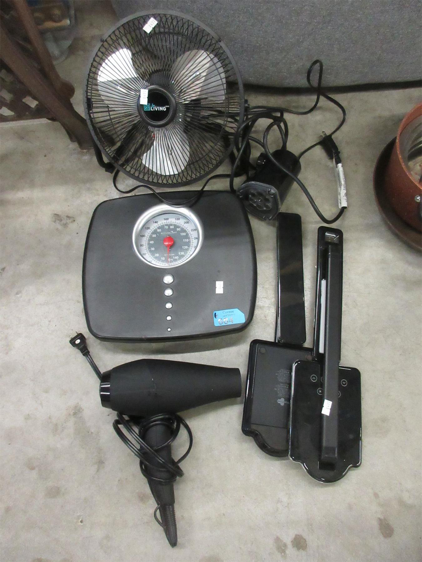 Hair dryer, body weigh scale, projection light, desk fan & 2 OttLites (no cables).
