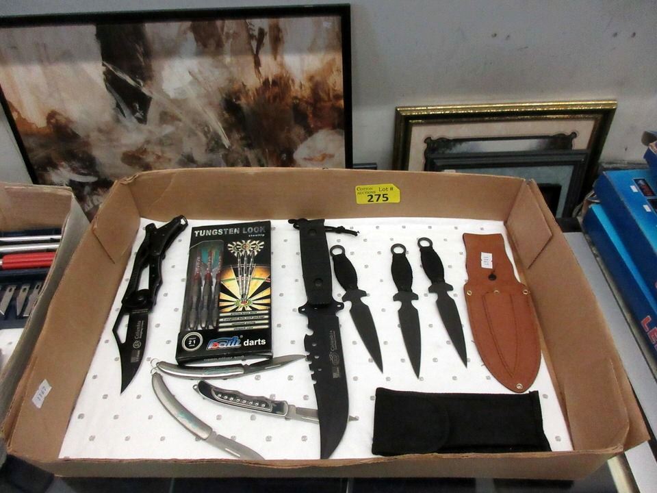 3 Pen knives, Columbia hunting knife, set of throwing knives and a folding knife with 3" blades.