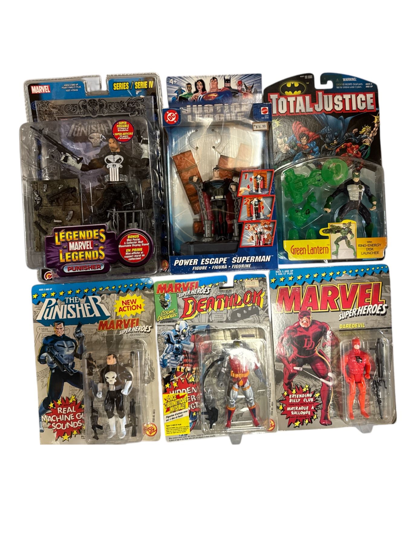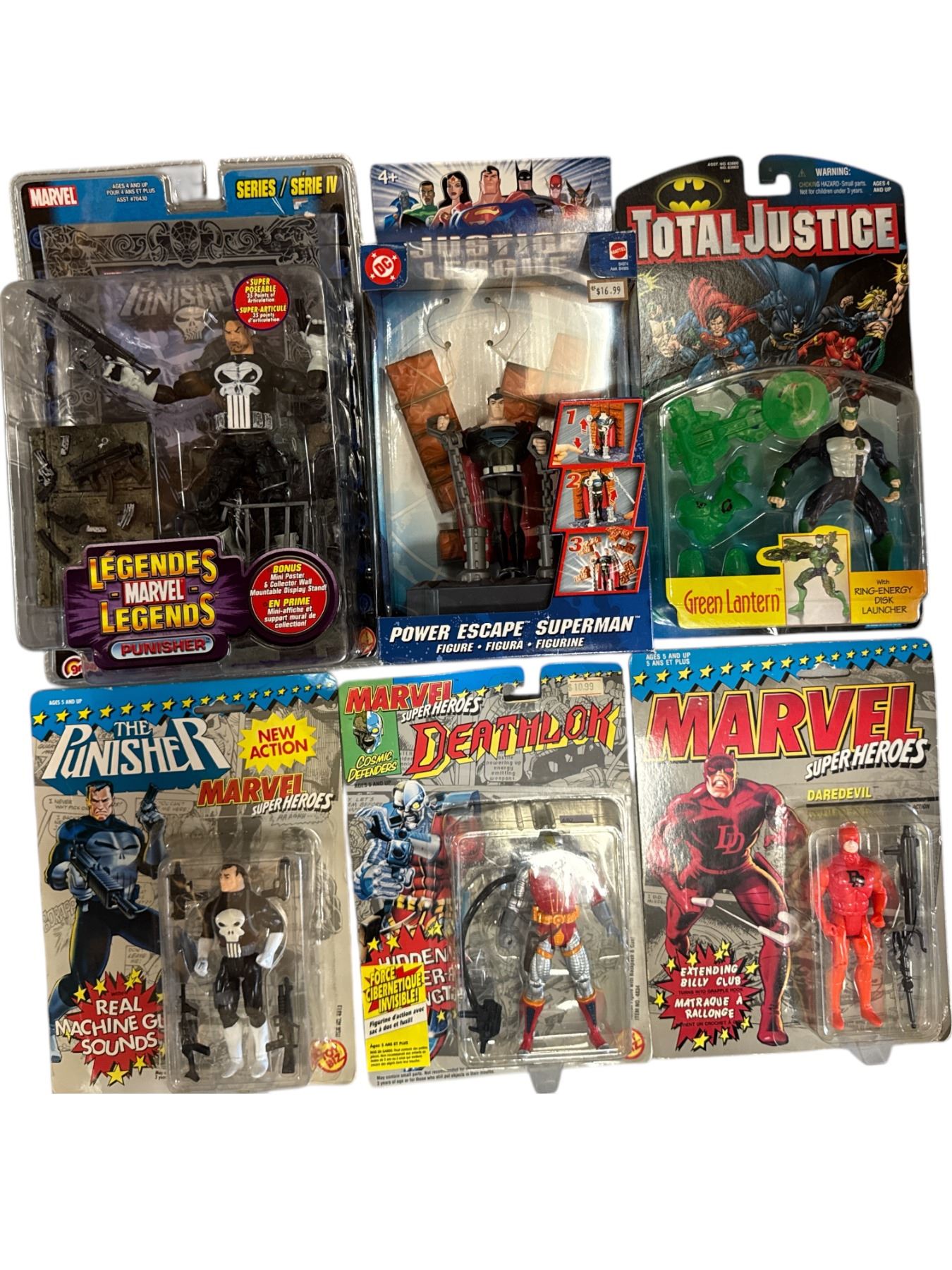 6 Assorted Unopened Action Figures: Dare Devil, Deathlok, Green Lantern, Punisher, & More