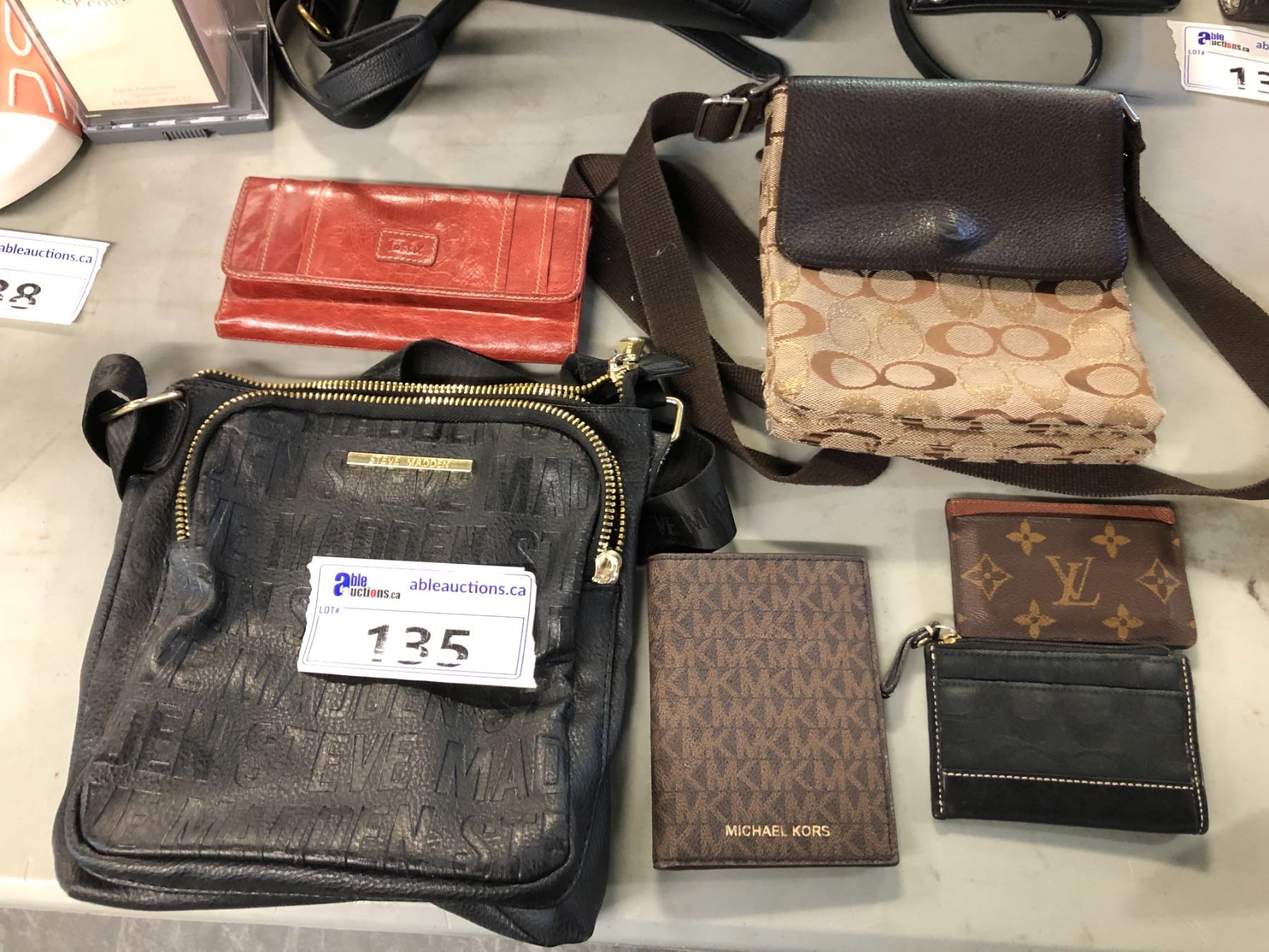 6 BAGS/ WALLETS MARKED STEVE MADDEN, COACH, MICHAEL KORS, LOUIS VUITTON AND MORE