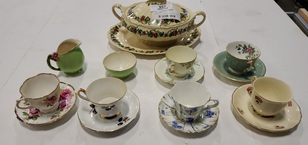 6 BONE CHINA CUPS AND SAUCERS, CREAM AND SUGAR, LIDDED SERVING DISH, AND PLATTER - AYNSLEY, ROYAL ANNE, ROYAL ALBERT, ETC