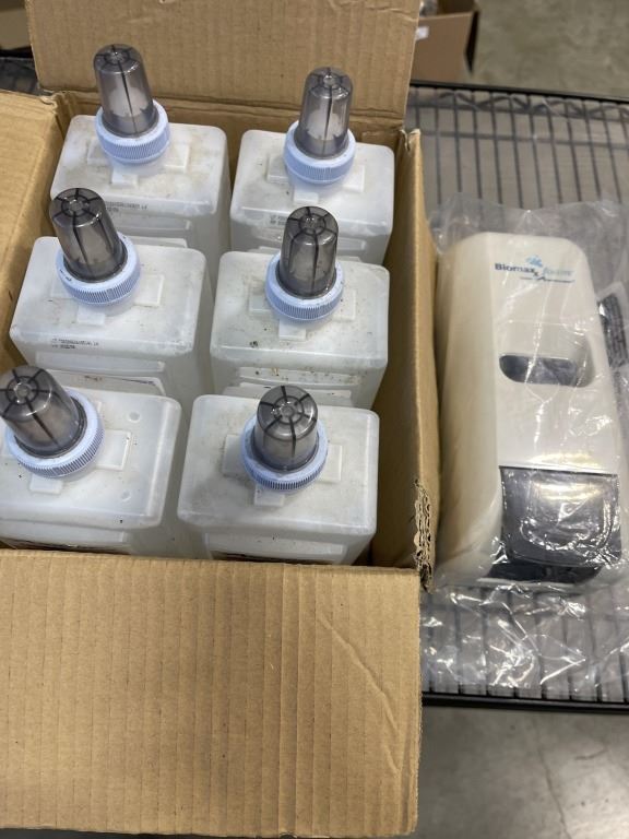 6 BOTTLES OF HAND SANITIZER AND DISPENSER
