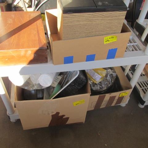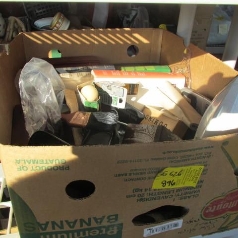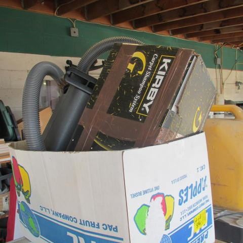 6 BOXES OF MISC. BOOKS, STEAMERS, KIRBY VACUUM PARTS, ETC.