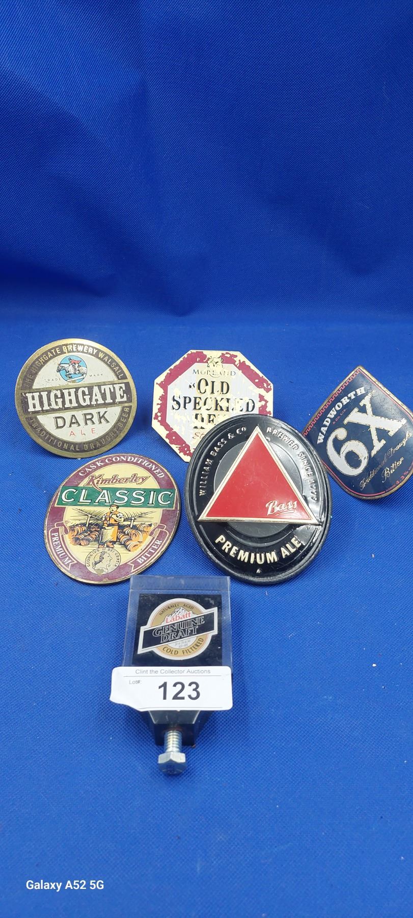 6 Bar tap badges, including Kimberly Classic, High Gate, Williams Ale, Labatts, Wadworth, 6x and Old Speckled