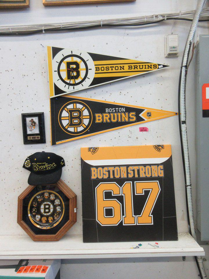 Metal pennant clock, framed collectors plate, 20" x 20" canvas art, pennant, and caps.