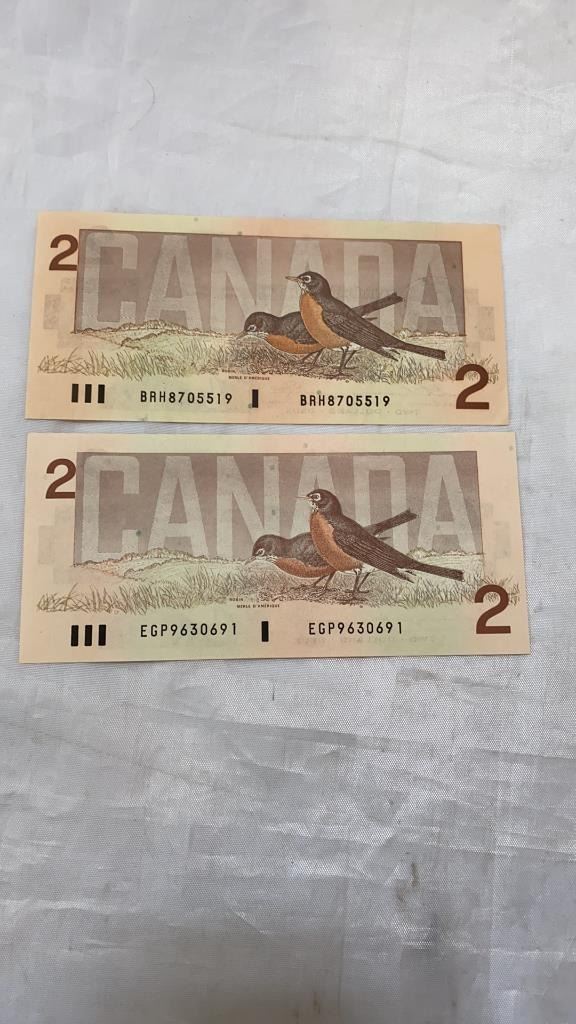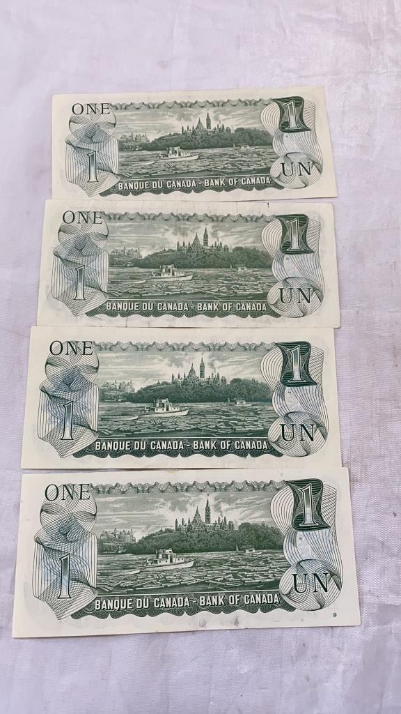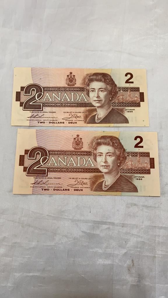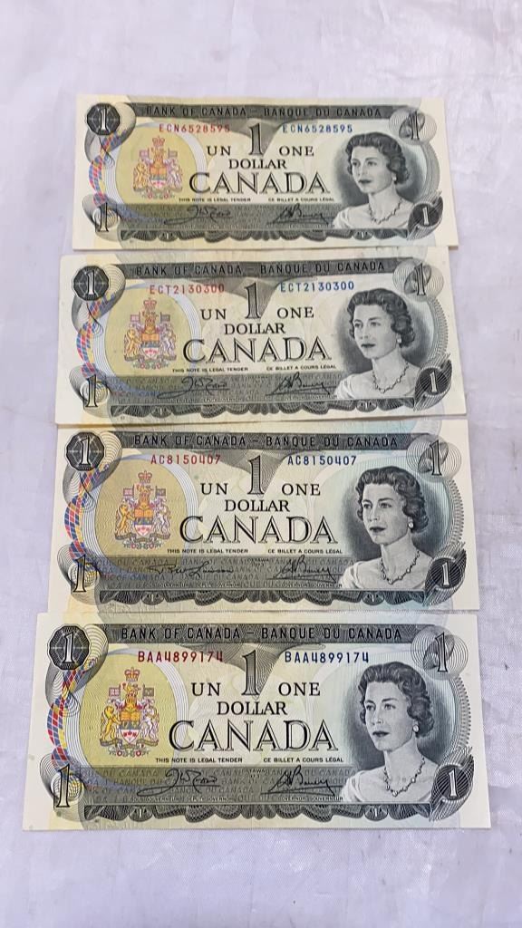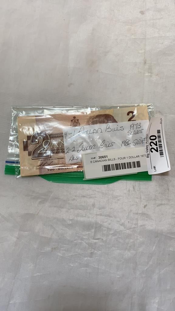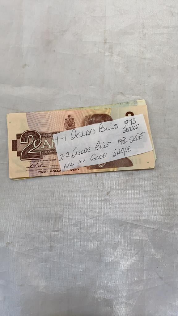 6 CANADIAN BILLS - FOUR 1 DOLLAR 1973, TWO 2 DOLLAR 1986