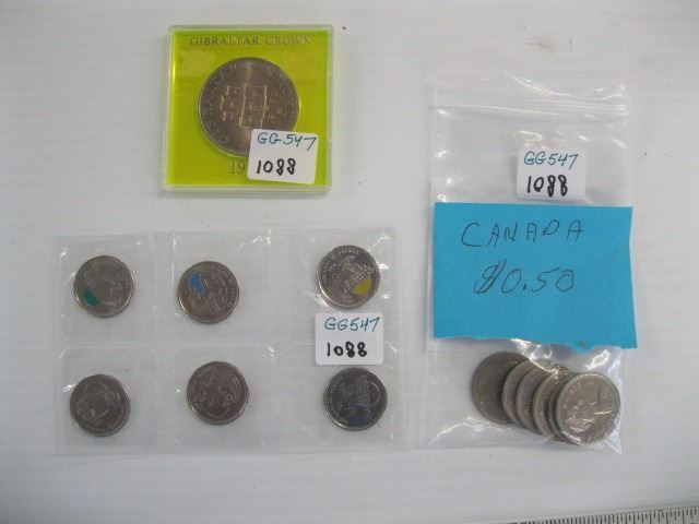 6 CANADIAN QUARTERS, A 1970 GIBRALTAR CROWN & 6 CANADIAN 50 CENT PIECES
