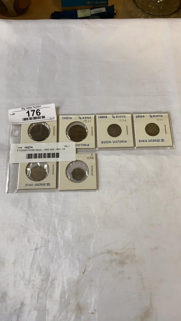 6 COINS FROM INDIA - 1835 AND 1862 1/4 ANNA, 1894 AND 1944 1/4 RUPEE, 1947 1 ANNA, AND 1958 COIN