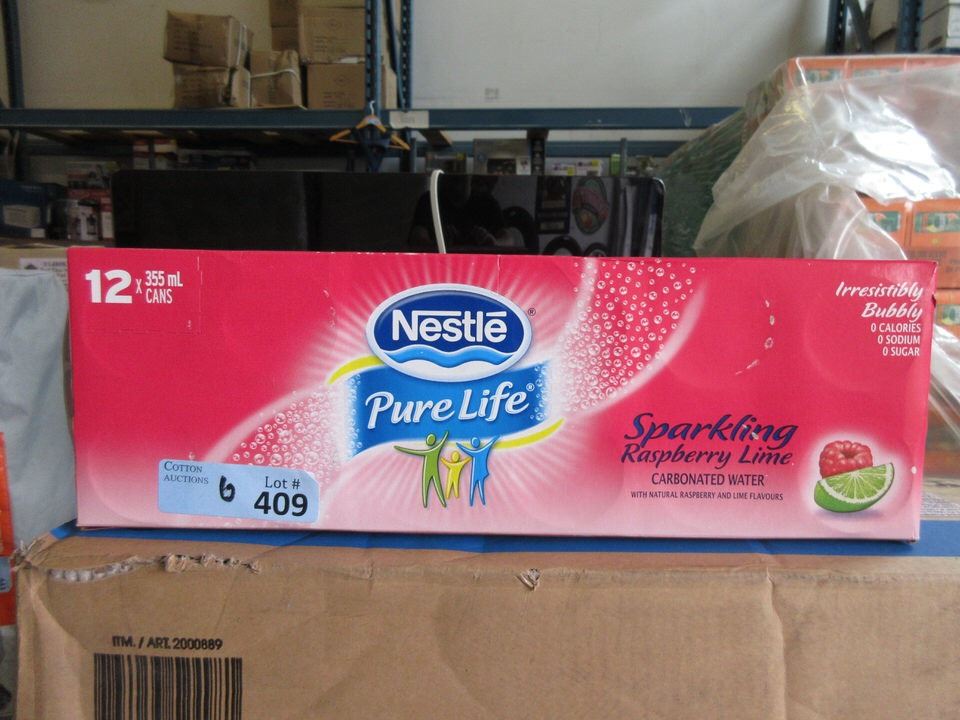 Nestle Pure Life. Natural flavours. Calorie-free, sodium-free, sugar-free. Each case has 12 x 355 ml cans. BB: July 2019