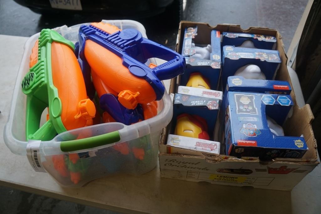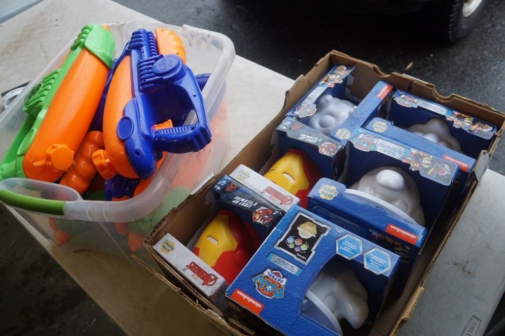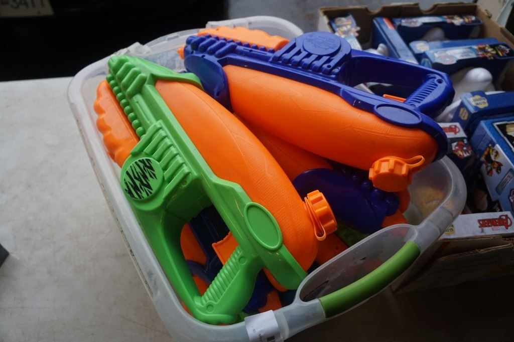 6 GLOW BUDDIES - IRON MAN AND PAW PATROL, BIN OF WATER GUNS, AND RIPSTIK