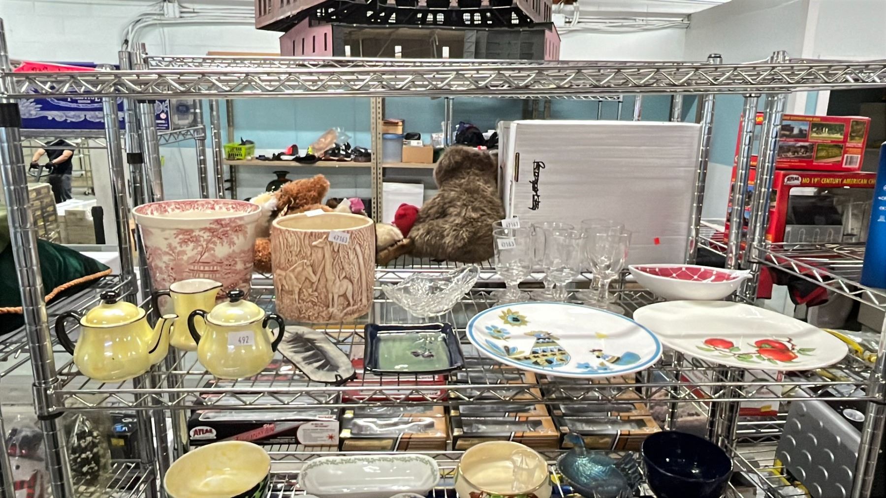 6 LIBBEY GLASSES, CHICKEN PLATE, APPLE PLATE, TEAPOT, CREAMER, SUGAR JAR & MORE