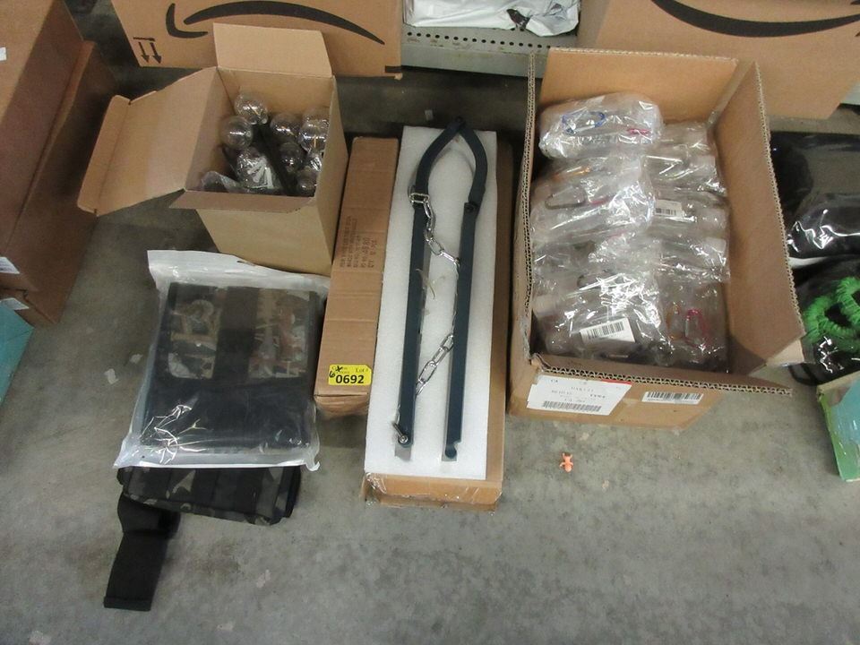 Box of travel squeeze bottles on carabiners, mini globe light string, seat back gun rack, wire fence repair tool and more.