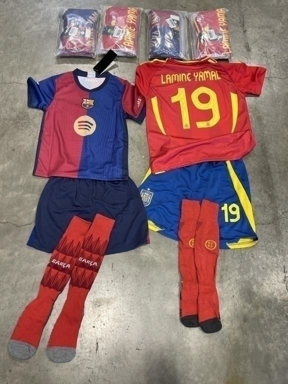 6 NEW 'LAMINE YAMAL' #19 BARCELONA SOCCER UNIFORMS, INCLUDES JERSEY, SHORTS AND SOCKS, 2 SIZE 20,