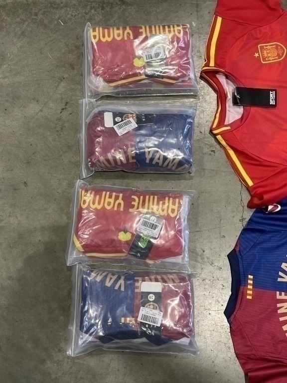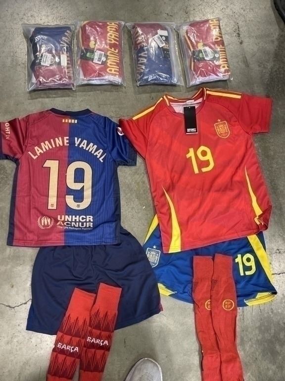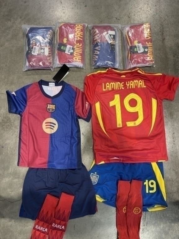 6 NEW 'LAMINE YAMAL' #19 BARCELONA SOCCER UNIFORMS, INCLUDES JERSEY, SHORTS AND SOCKS, 2 SIZE 20, 1 SIZE 22, 1 SIZE 24, 1 SIZE 26, AND ONE SIZE 28, RETAIL $25 EACH, TOTAL $150