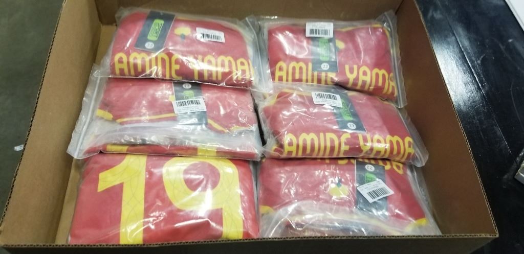 6 NEW 'LAMINE YAMAL' #19 BARCELONA SOCCER UNIFORMS, INCLUDES JERSEY, SHORTS AND SOCKS, ALL SIZE 22, RETAIL $25 EACH, TOTAL $150