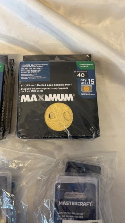 6 NEW PACKS MAXIMUM 5 INCH HOOK AND LOOP SANDING DISCS AND 9 NEW MASTERCRAFT MINI WIRE BRUSH SETS - RETAIL $135