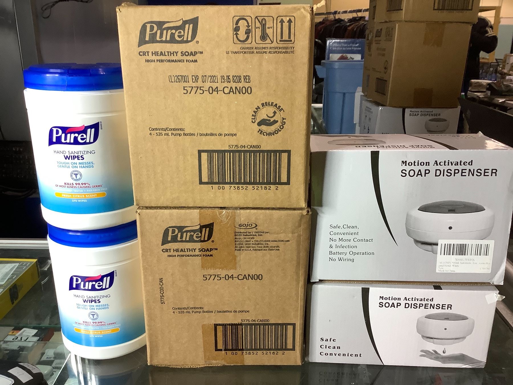 6 NEW PRODUCTS; 2 MOTION ACTIVATED SOAP DISPENSERS, 2 CASES(8 QTY) PURELL CRT HEALTHY SOAP, 2 PURELL HAND SANITIZING WIPES