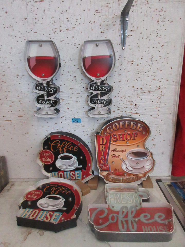 2 Wine glasses (7" x 14") and 4 assorted "coffee" signs (average size is 12" x 12").
