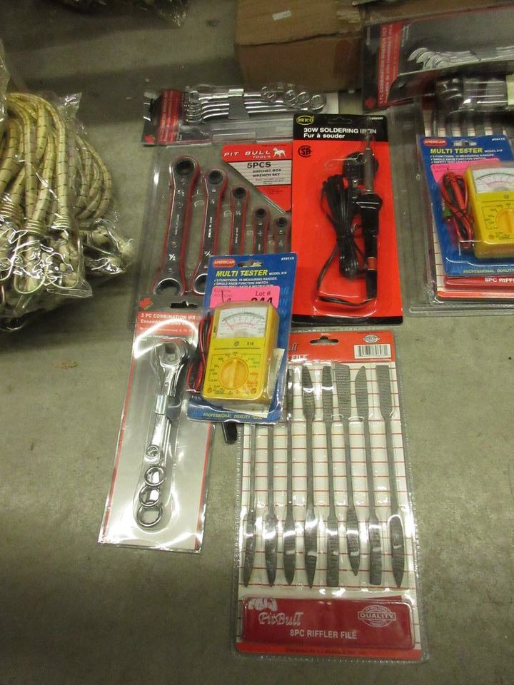 Two 5 piece wrench sets, soldering iron, file set, 5 piece wrench set & multi tester.