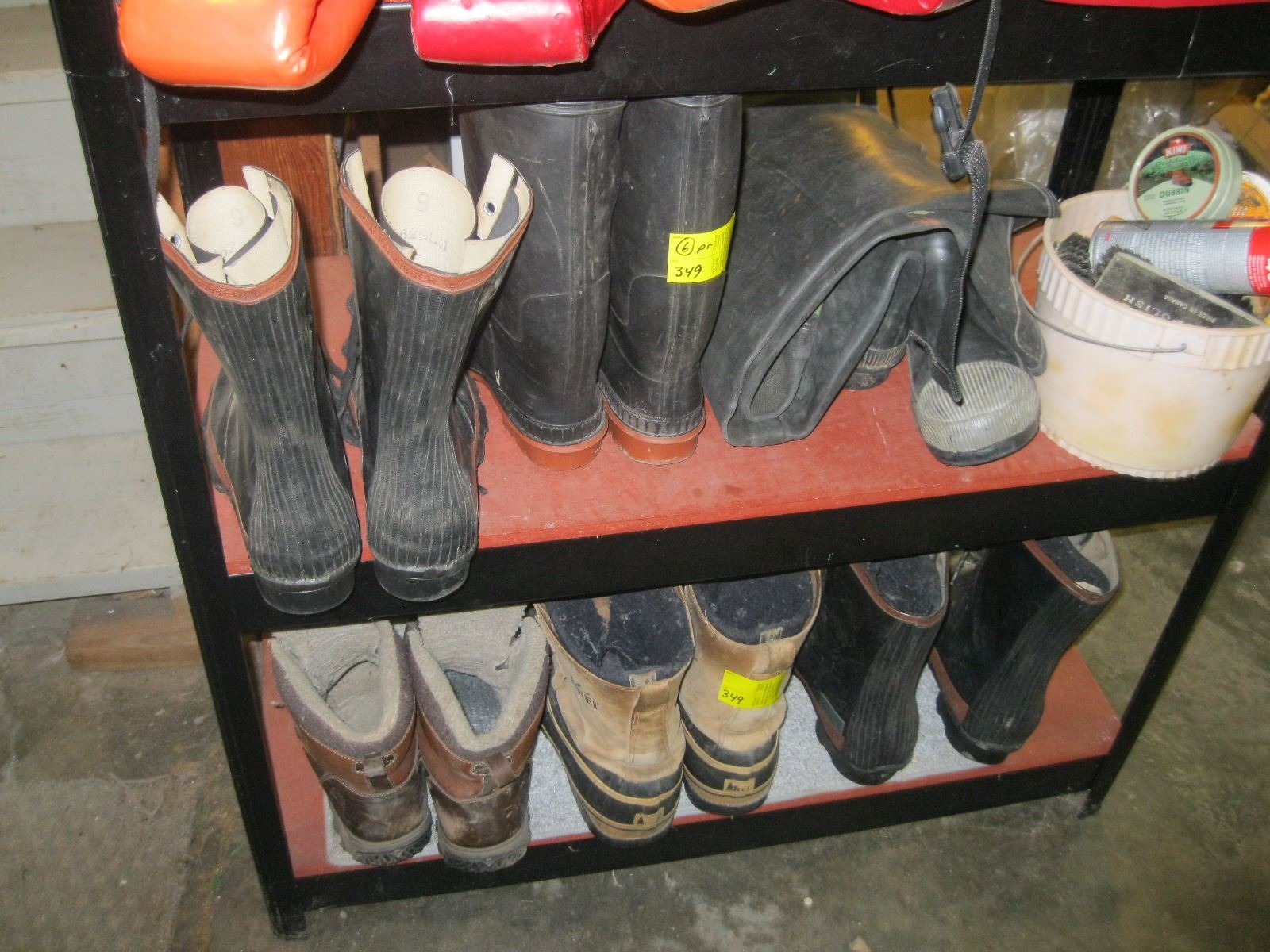 6 PAIR OF ASST. BOOTS & BUCKET OF SHOE SHINE ACCESS.