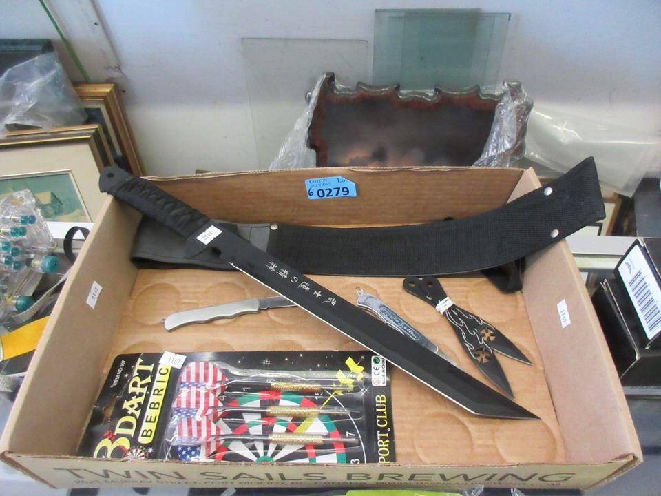 1 Package of darts, 1 machete, 2 throwing knives and 2 pocket knives.