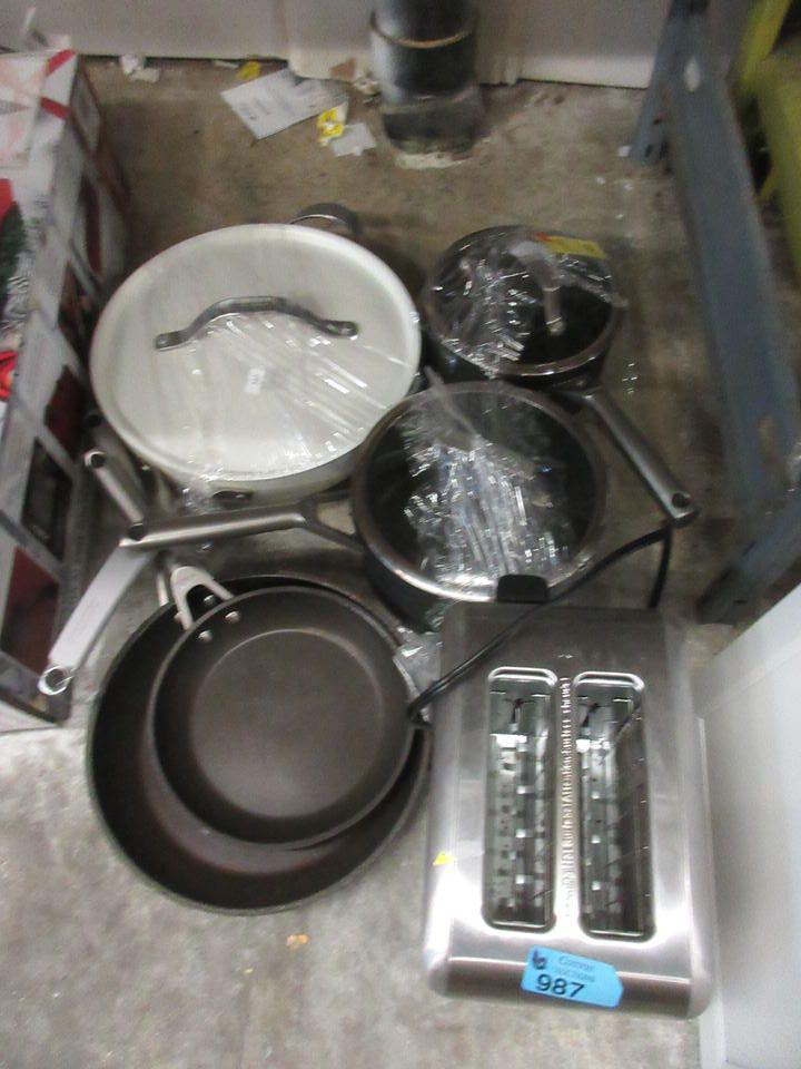 2 Slice toaster, 2 pots with glass lids, Tramontina enameled cast iron pan with lid, and 2 Ninja non-stick fry pans. Customer returns.