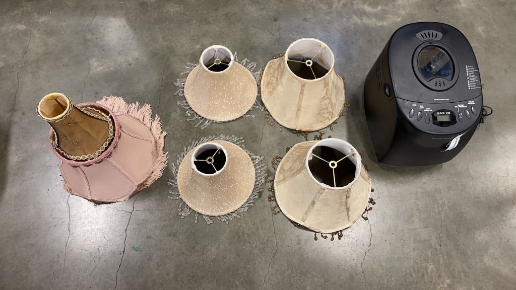 6 TABLE LAMP SHADES, 2 PAIRS, BEADED AND IN GOOD SHAPE AND HAMILTON BEACH BREAD MAKER