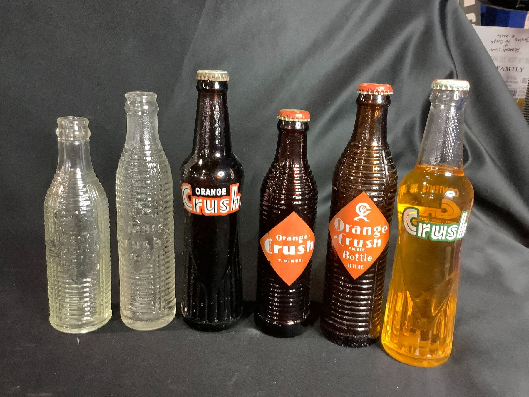 6 VINTAGE ORANGE CRUSH BOTTLES, SOME FULL