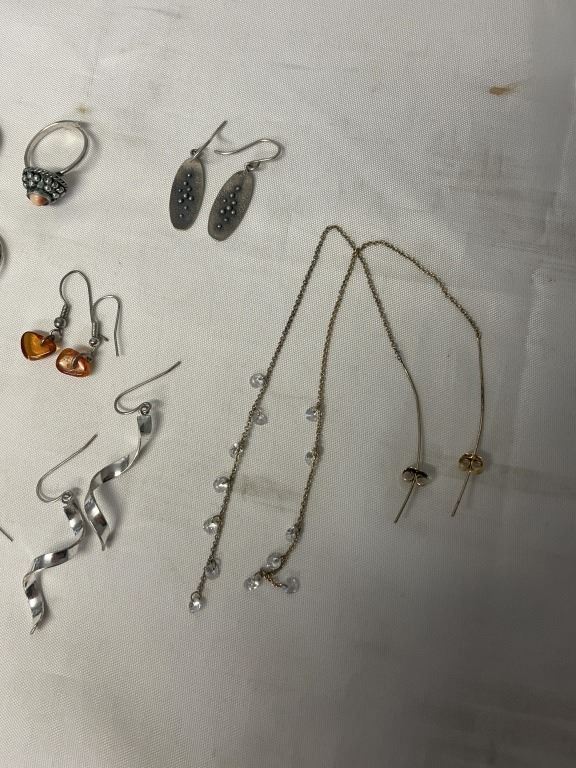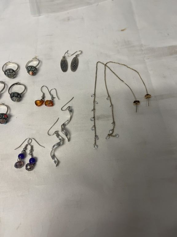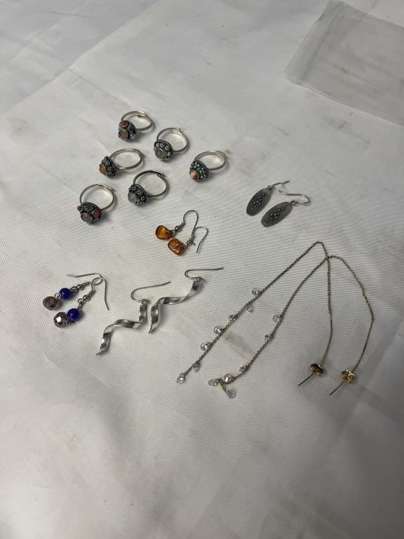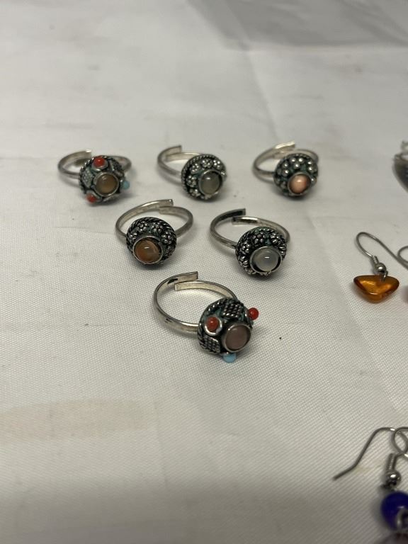 6 VINTAGE SEMI PRECIOUS STONE RINGS WITH 5 PAIRS OF EARRINGS