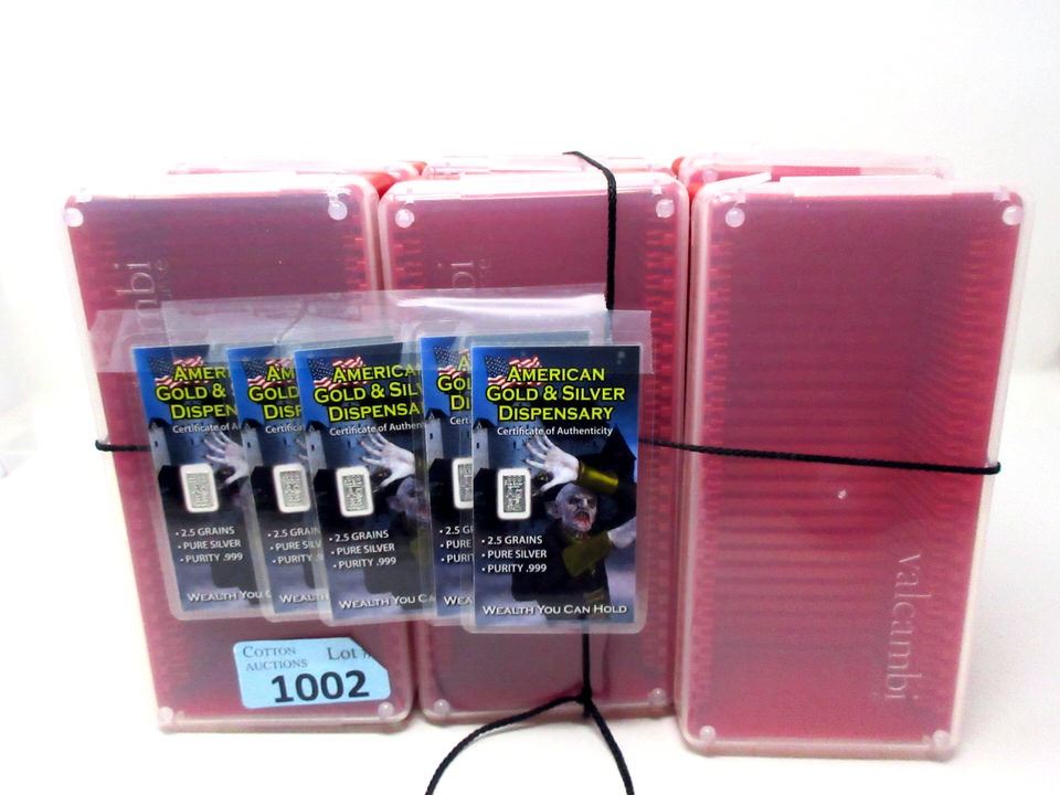 Total of 12.5 grains of silver on assay cards with Vampire images. Valcambi boxes each have 25 slots for precious metal storage.