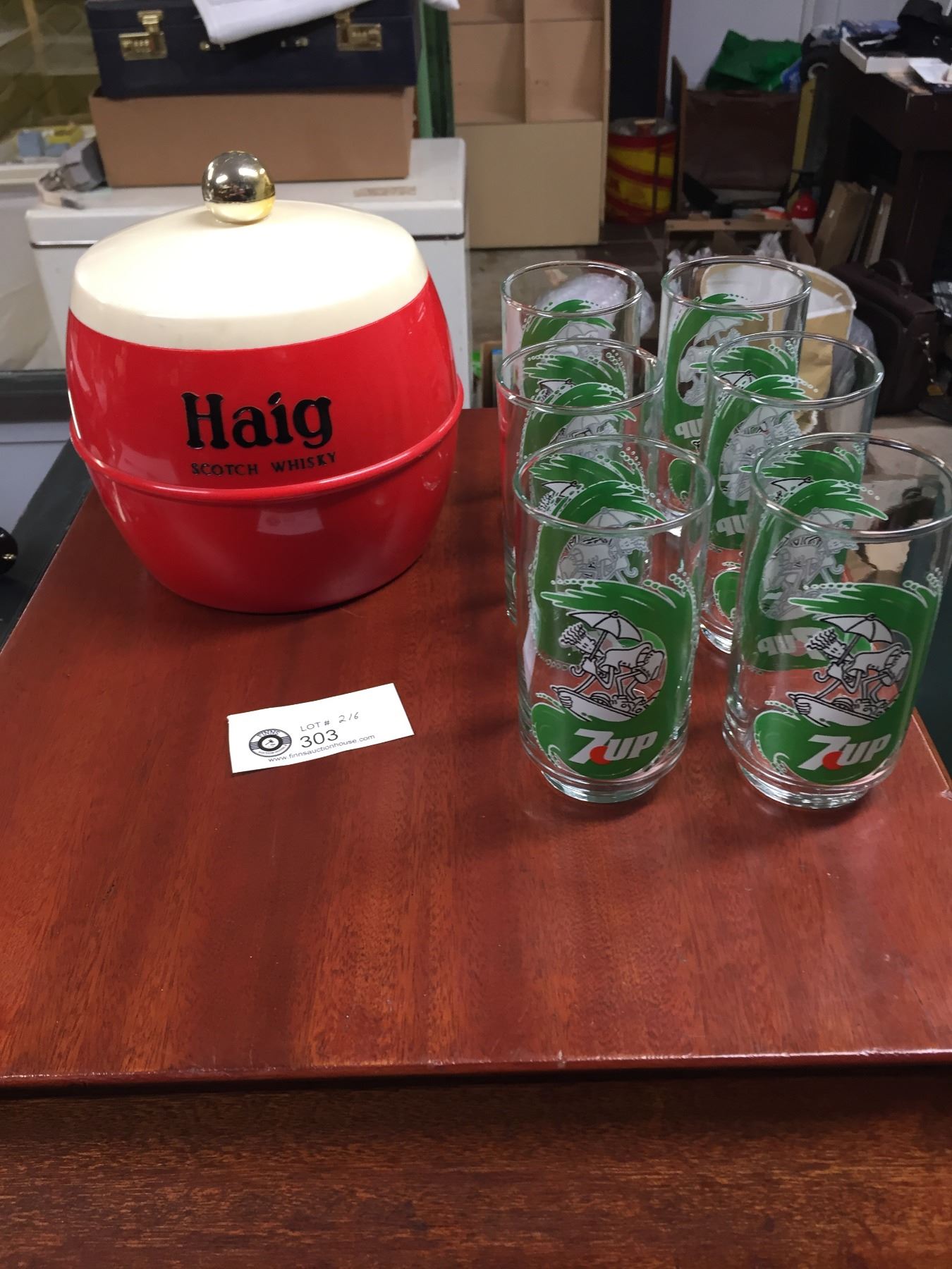 6 Vintage 7 Up Glasses and a Old Haig Scotch Whiskey Ice Cube Holder
