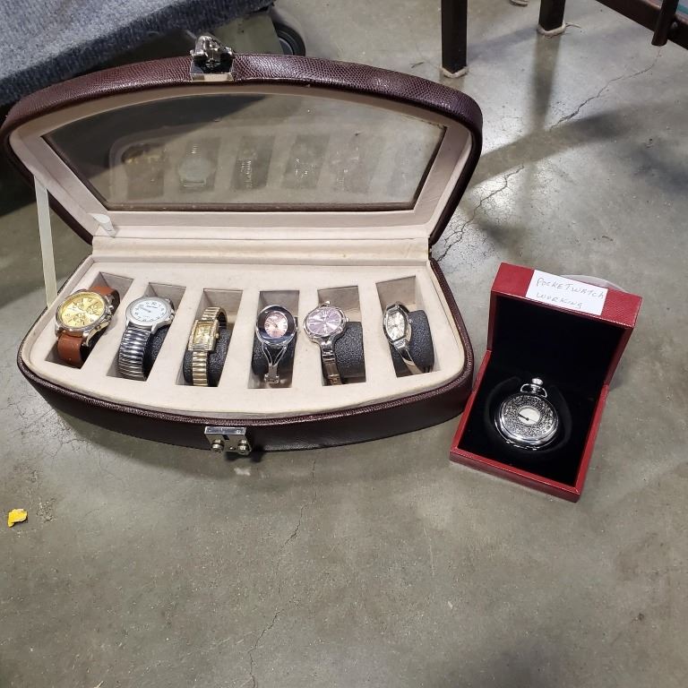 6 WATCHES IN CASE AND POCKET WATCH - ALL WORKING