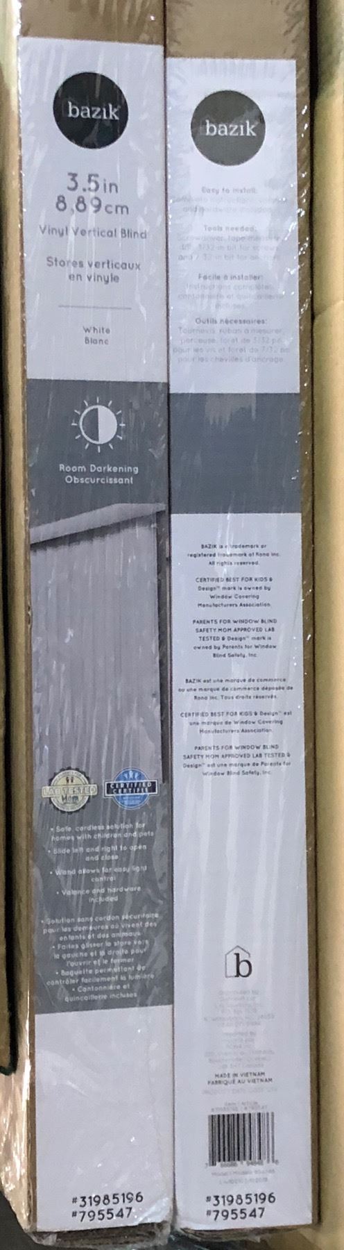 6 boxes of 2 New Bazik vinyl vertical blinds, 66  wide x 84  long, 3 1/2  blades