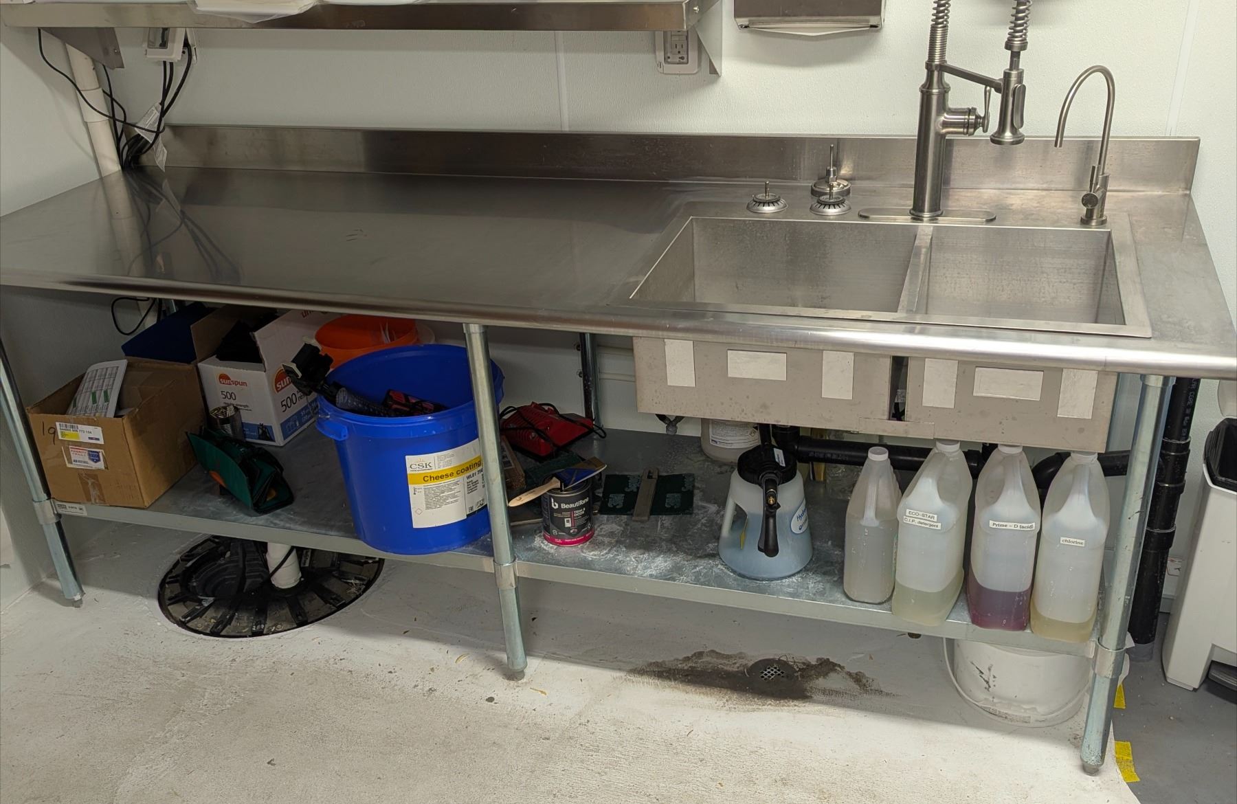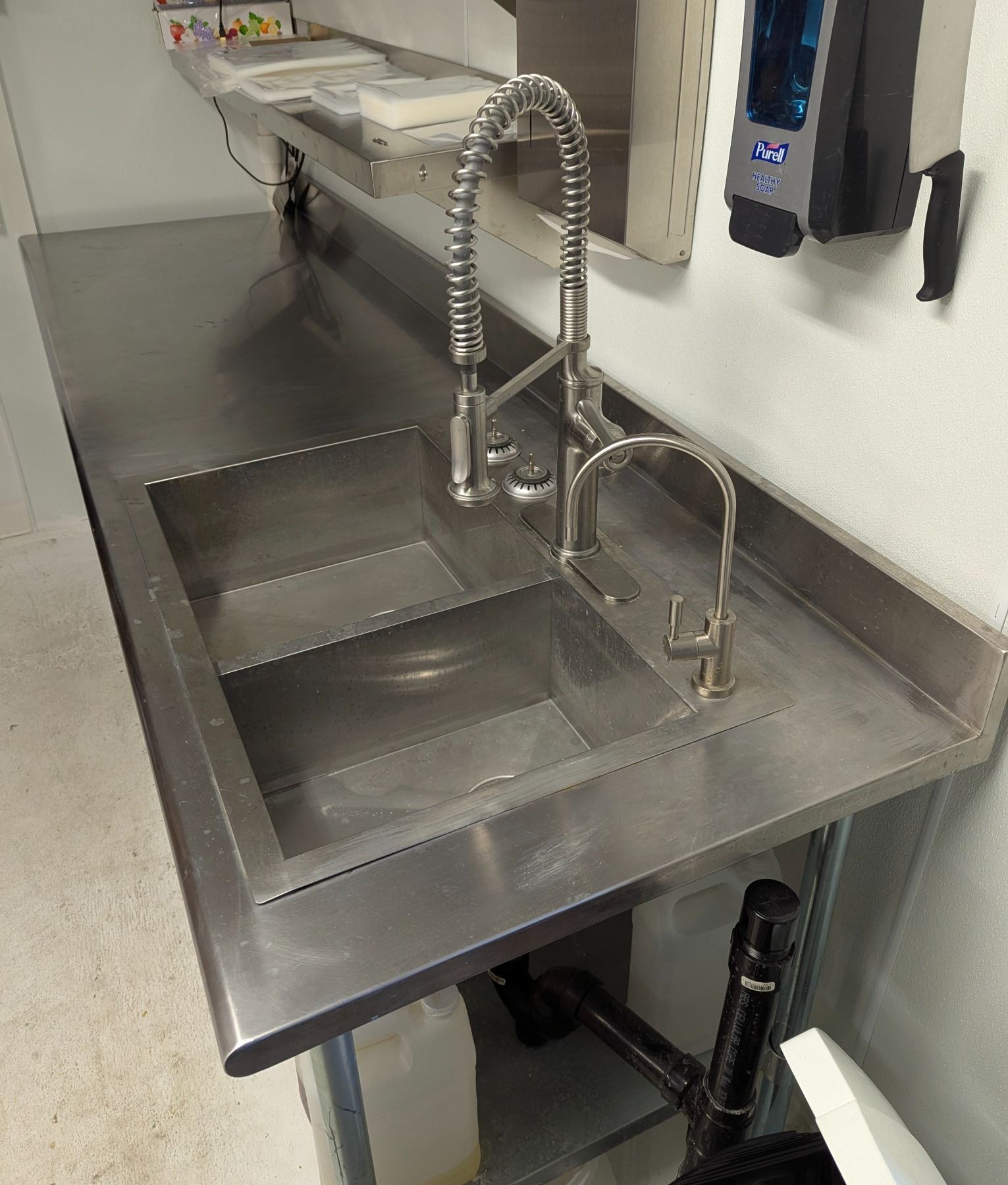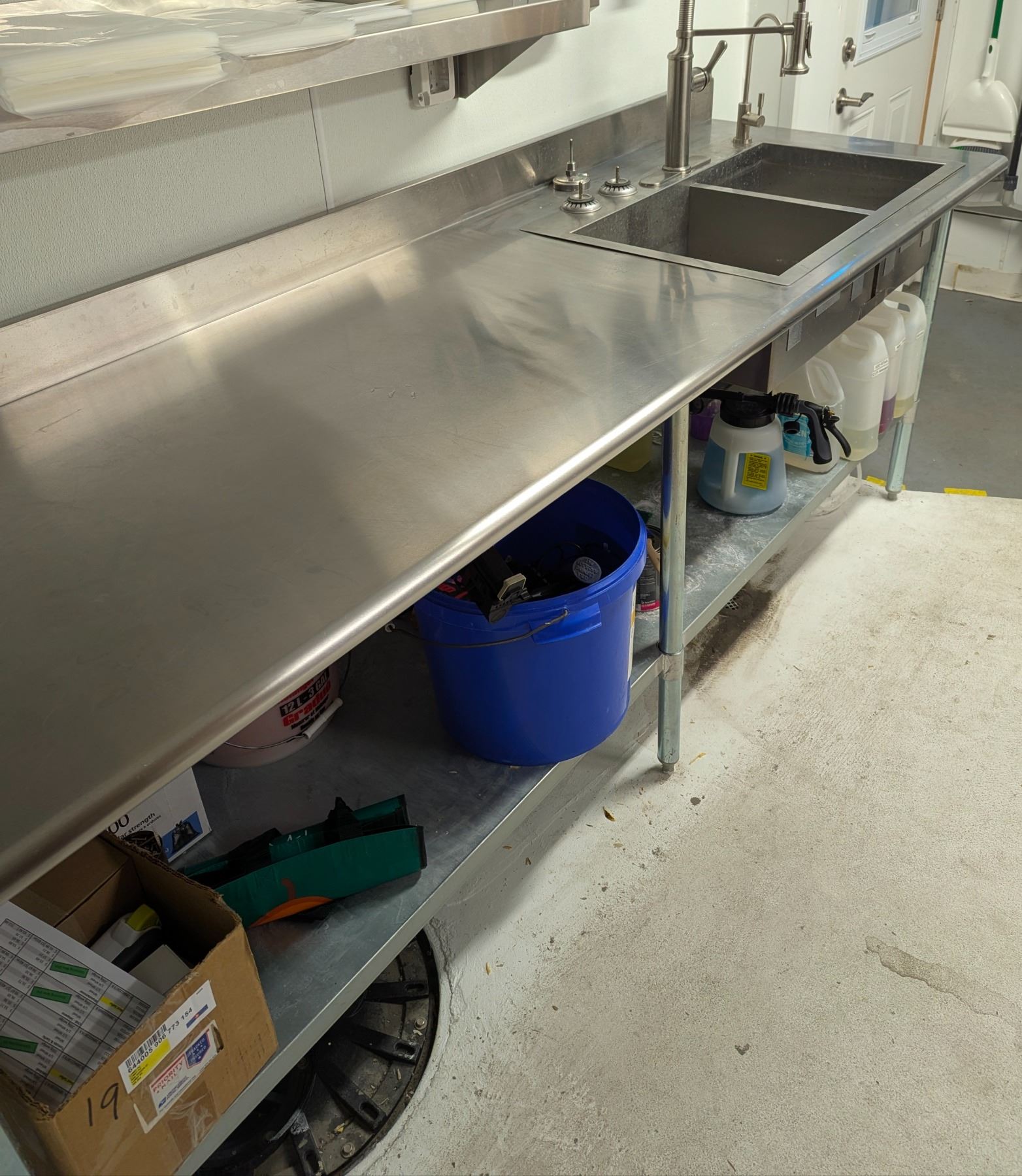 Almost brand new stainless table with a double compartment sink. Comes with the drain plumbing, sink plugs and the water faucet shown in pictures.