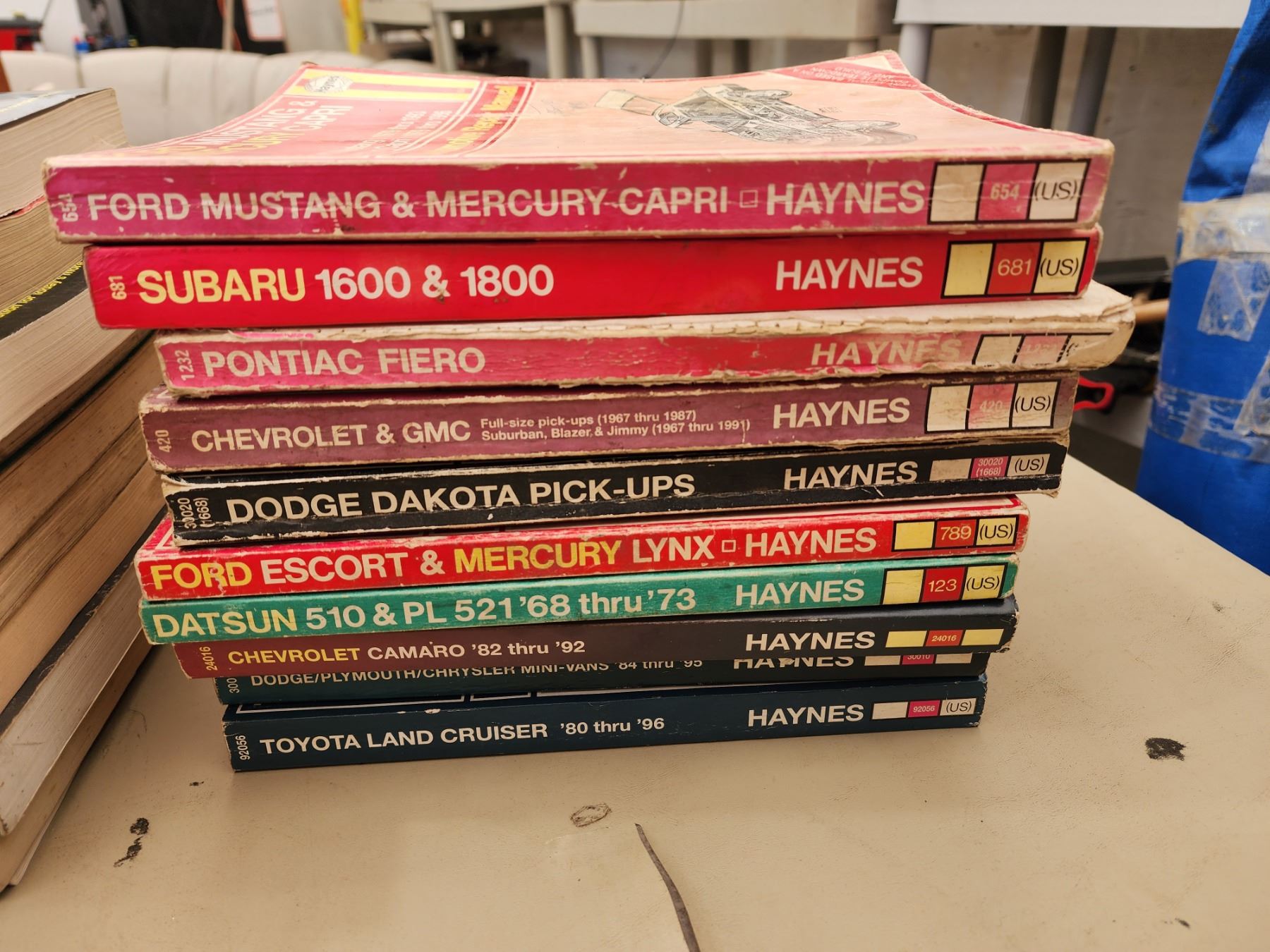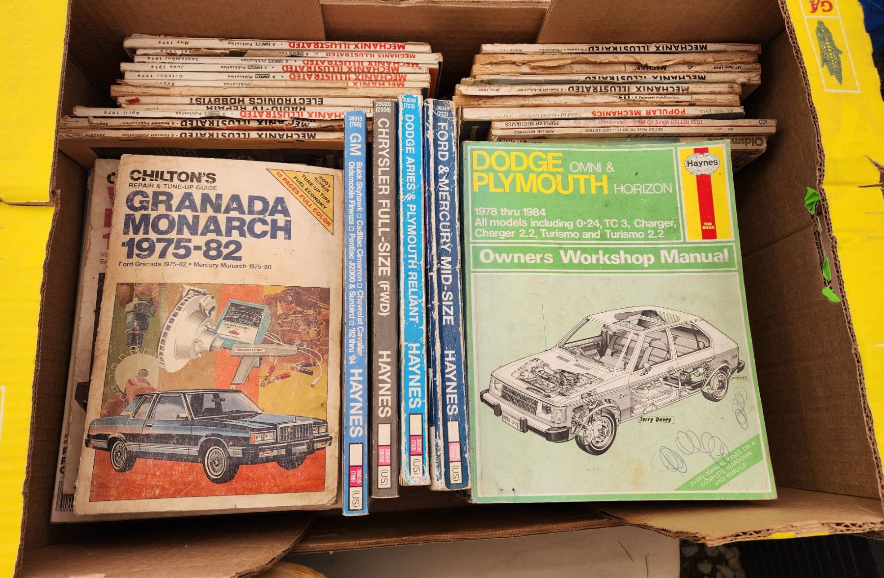 624 -- BIG BOX LOT OF HAYNES MANUALS AND VINTAGE GUNS AND AMMO MAGAZINES