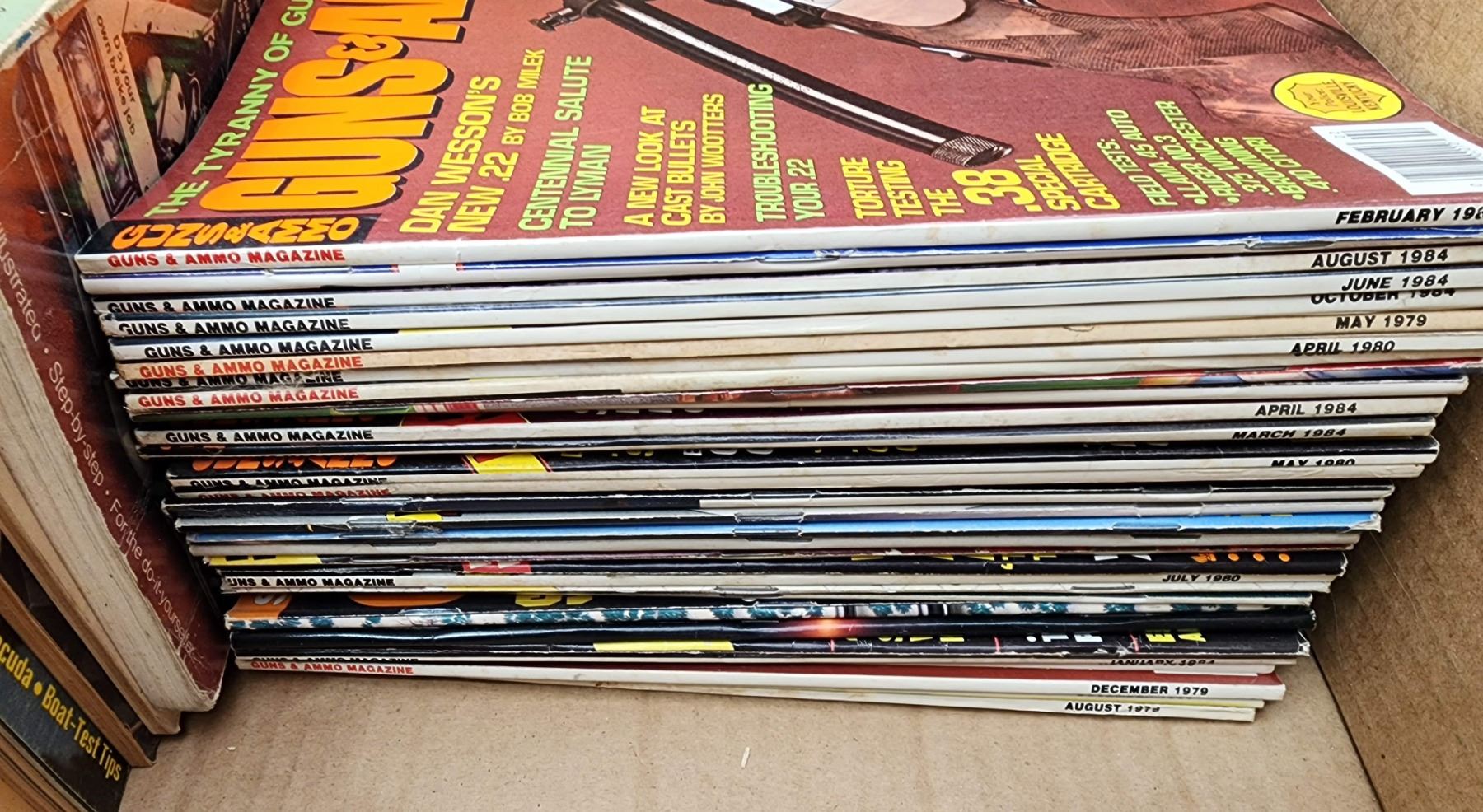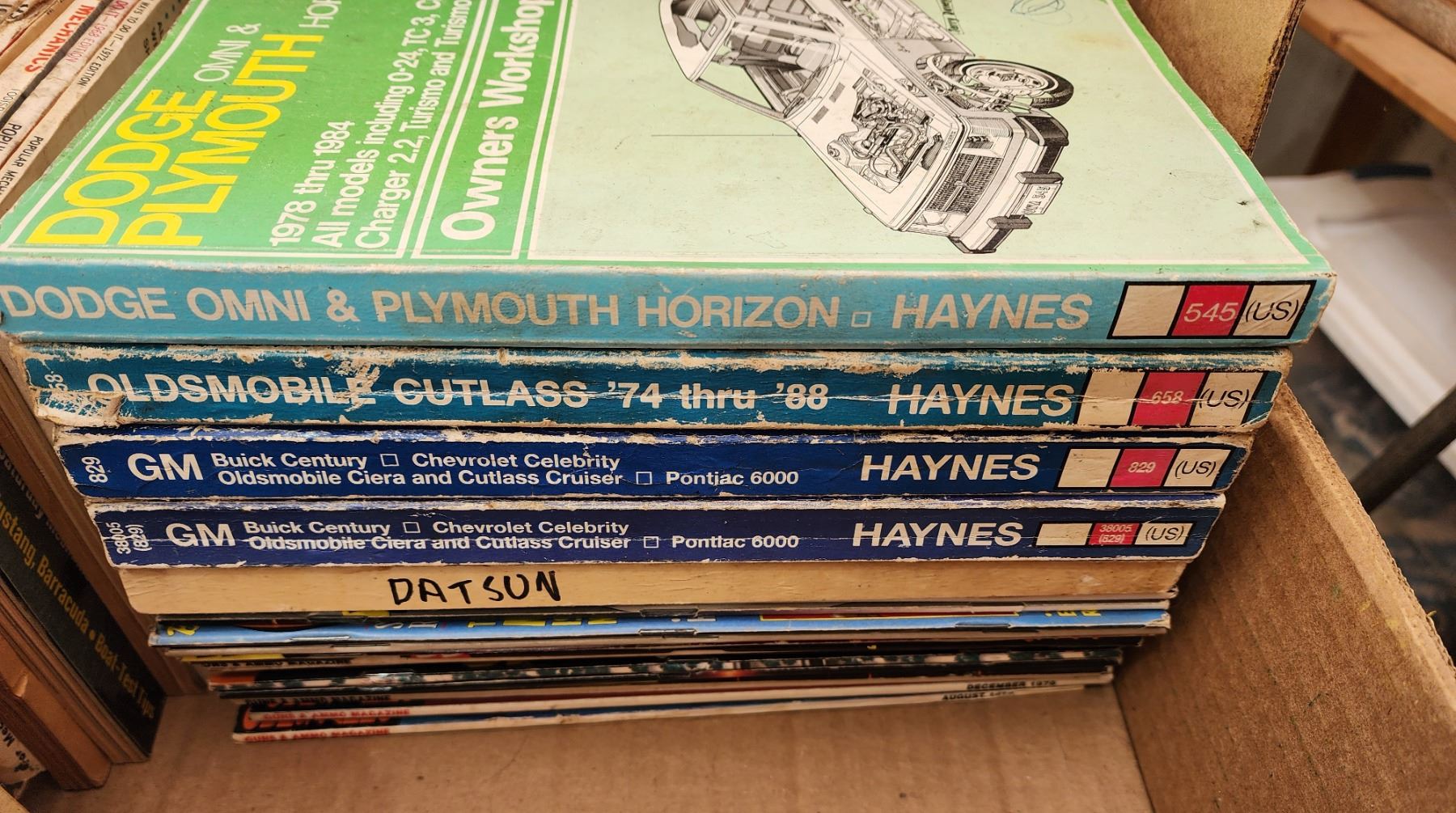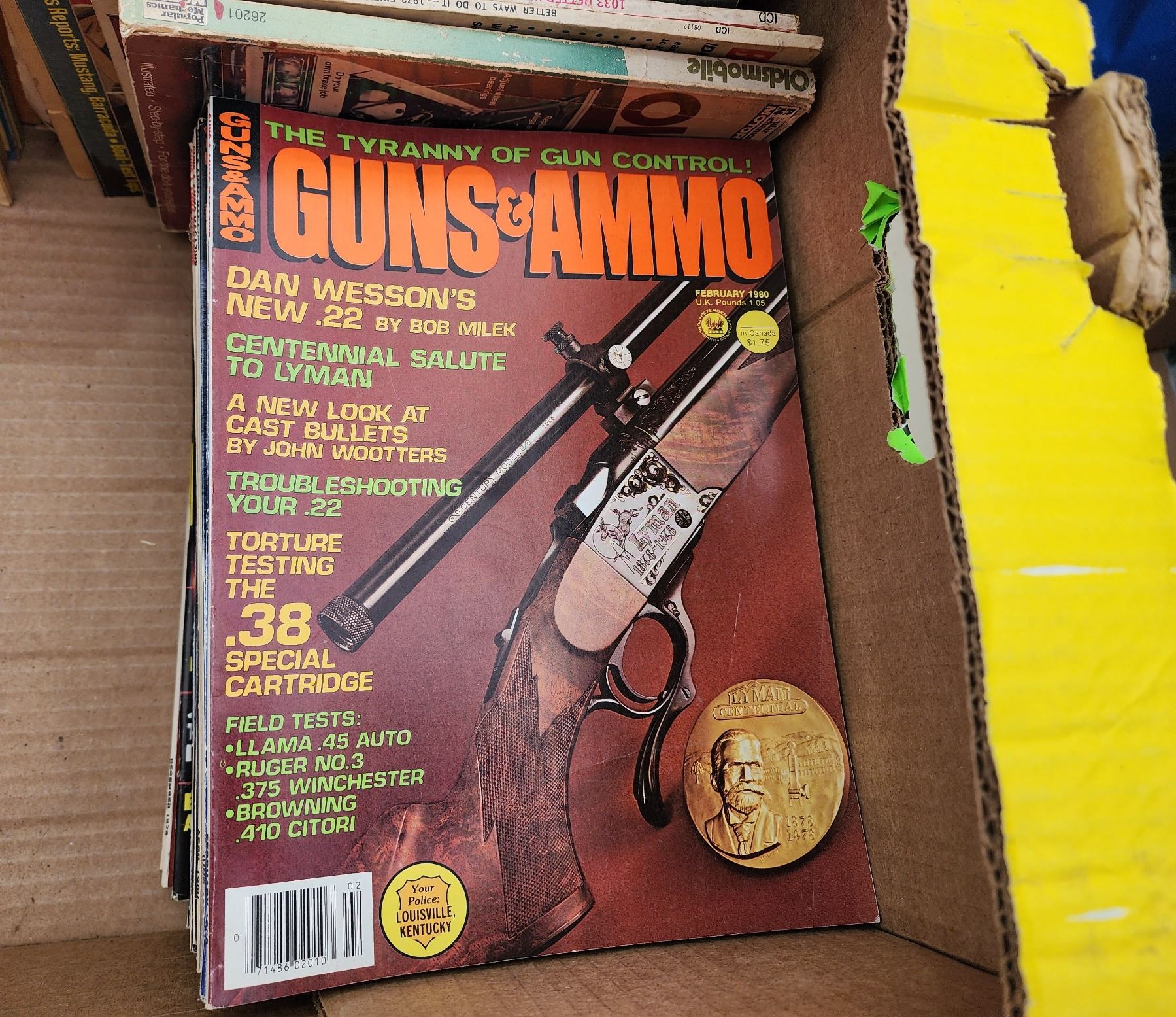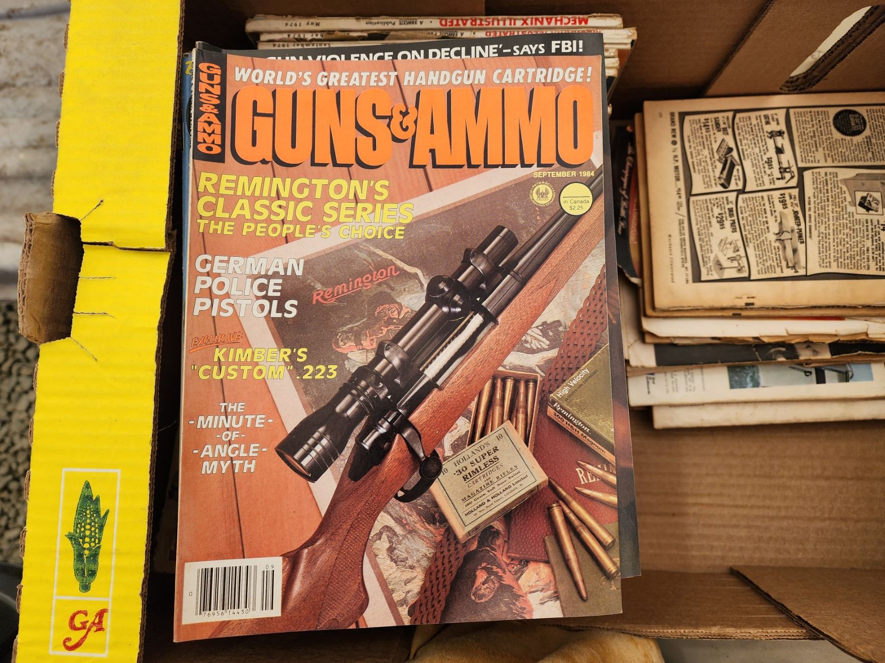 BIG BOX LOT OF HAYNES MANUALS AND VINTAGE GUNS AND AMMO MAGAZINES