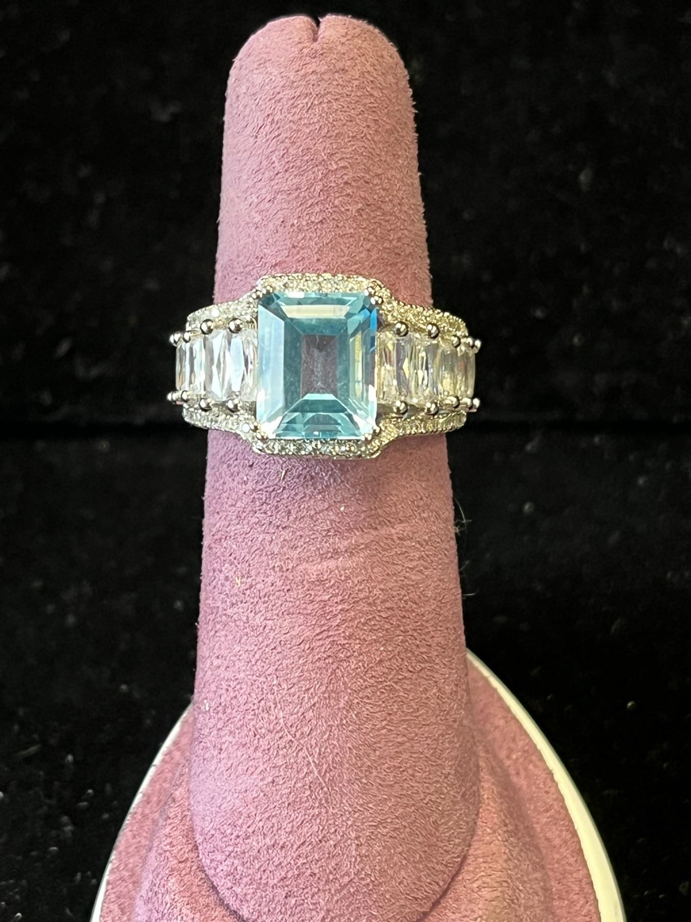 625S 4.0 CARAT EMERALD CUT SWISS BLUE TOPAZ RING WITH BAGUETTE SIDESTONES, MOUNTED IN 925 STERLING SILVER WITH WHITE GOLD OVERLAY - SIZE 6