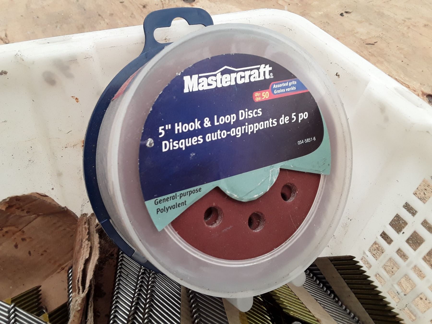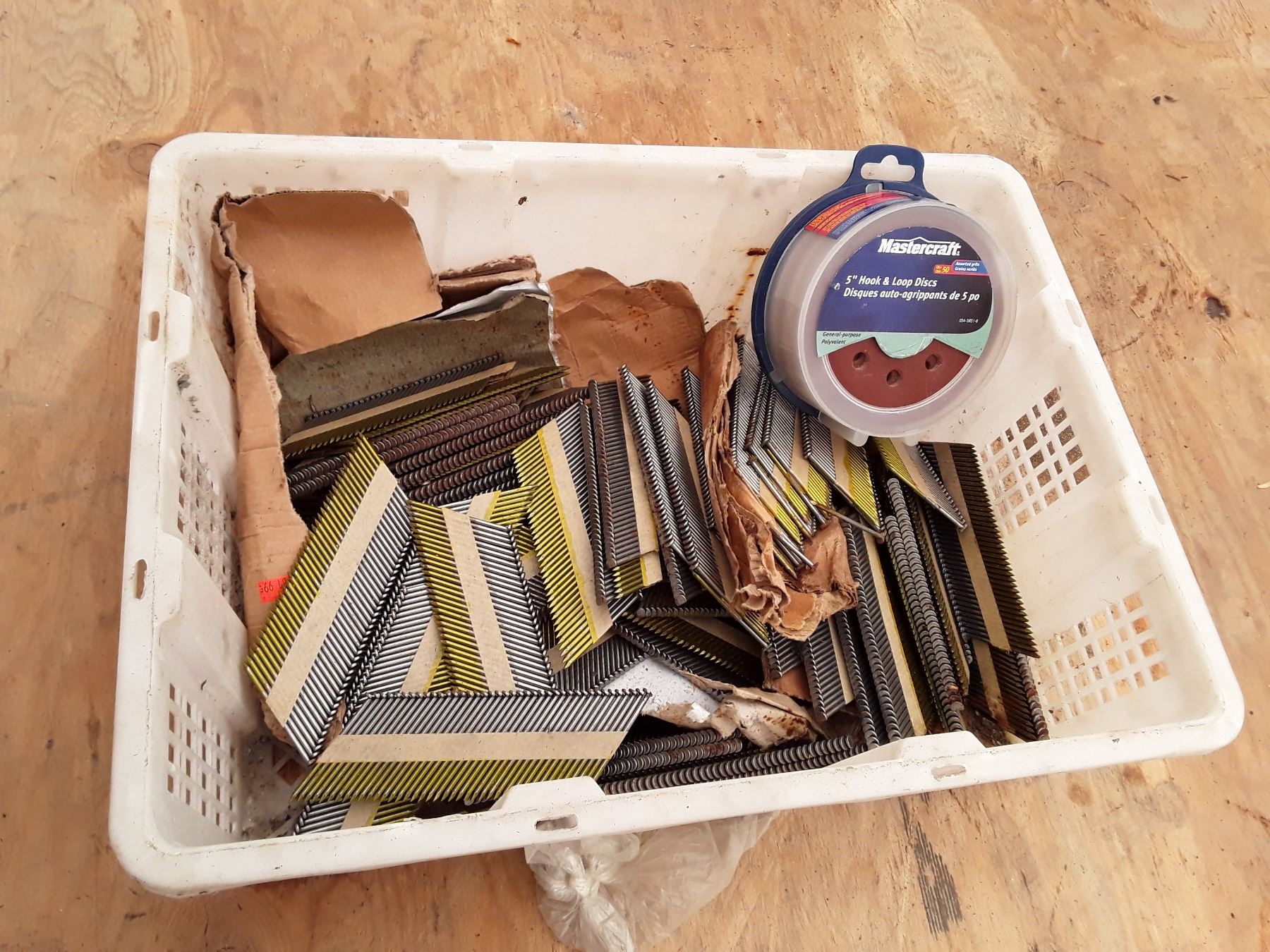 Bin of Nail Gun Nails and Disc Sandpaper - 17% Buyer Fee. Payment Processed through Live Auction World ( Visa or Master Card ) pick up Saturday, or Tuesday