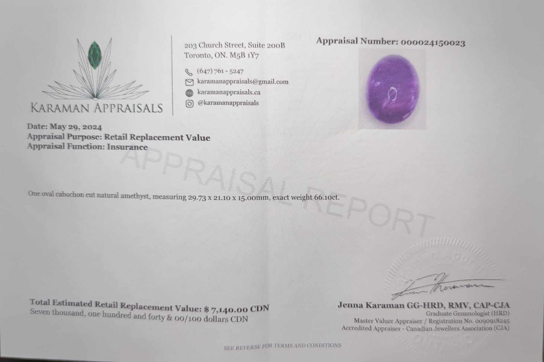 66.10 CT CERTIFIED FANCY AMETHYST GEMSTONE ($7,140 APPRAISAL) **APPRAISAL NOT GUARANTEED**