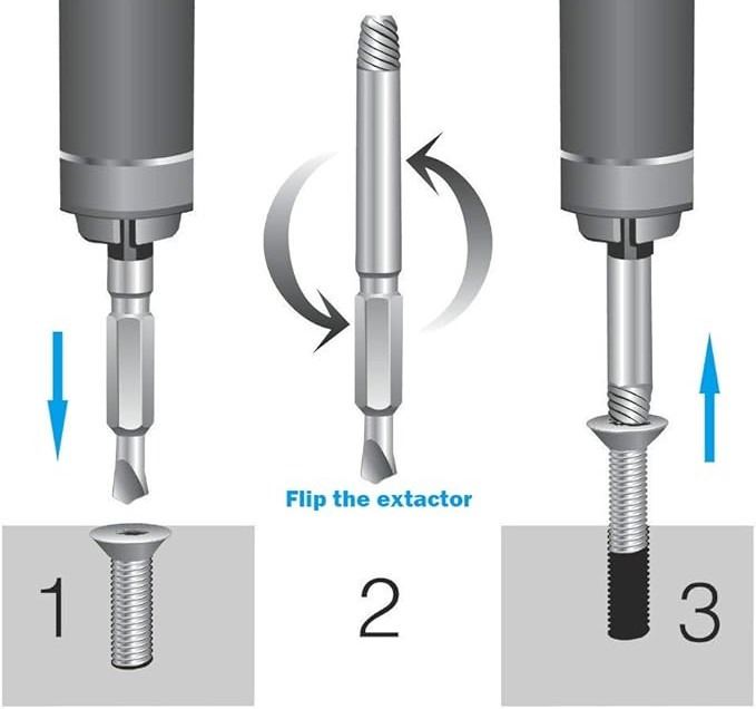 - 6-Piece Set - Works on Almost All Screw Sizes; The 6-piece screw extractor set works with the most commonly used tip and any screw or bolt. Extra # 2 for compatible backup used frequently.