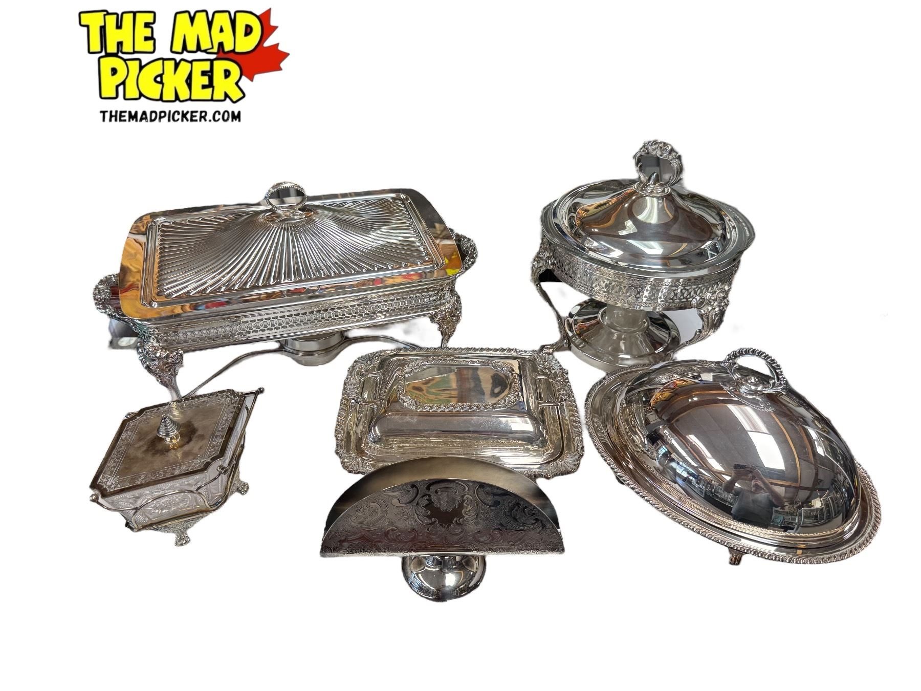 6x Vintage Serving Set: Chaffing Dishes, Candy Bowl, Napkin Holder