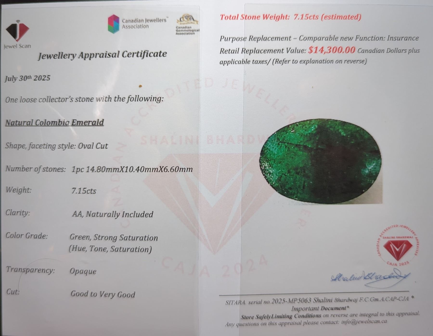 7.15 ct Certified Emerald gemstone ($14,300 Appraisal)