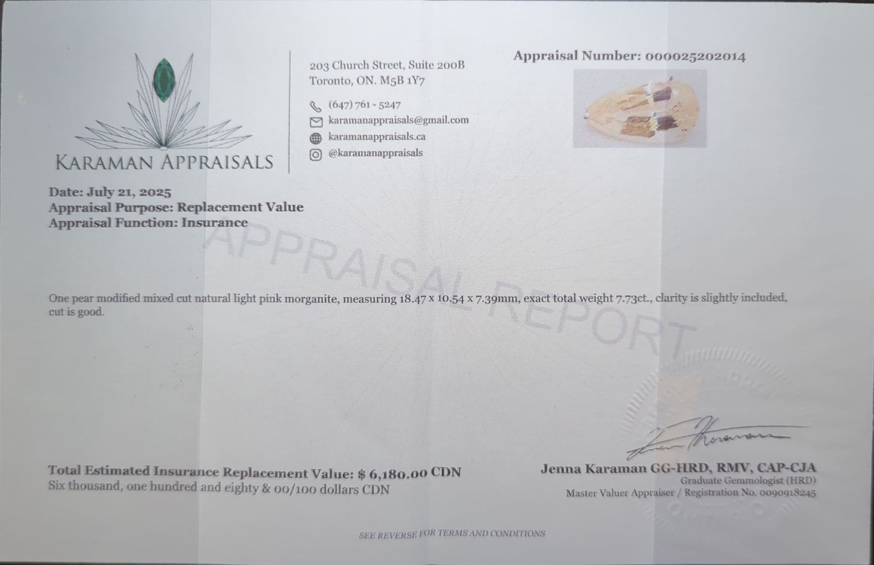 7.73 ct Certified Pink Morganite gemstone ($6,180 Appraisal)