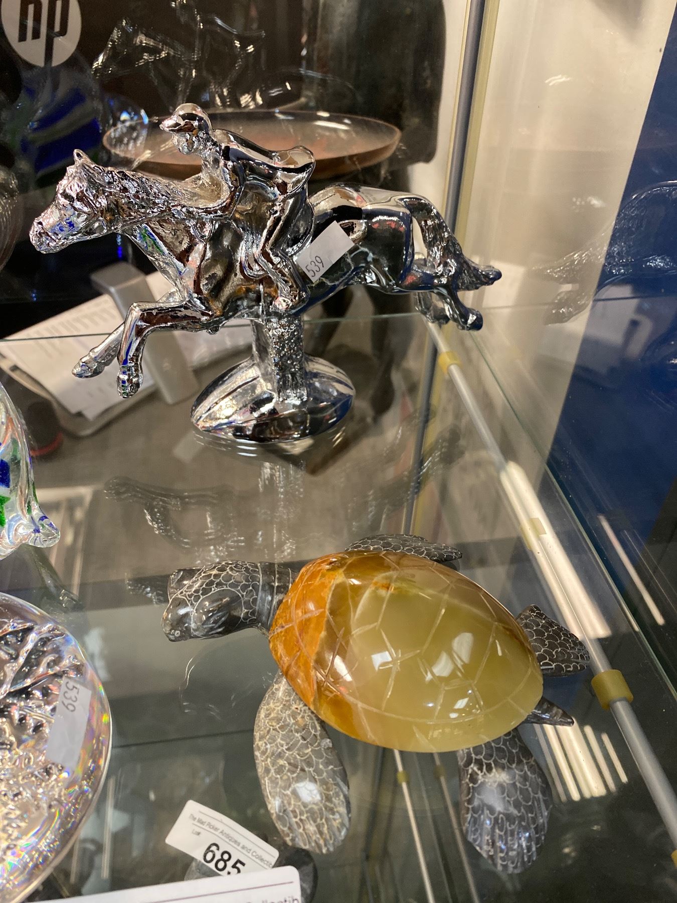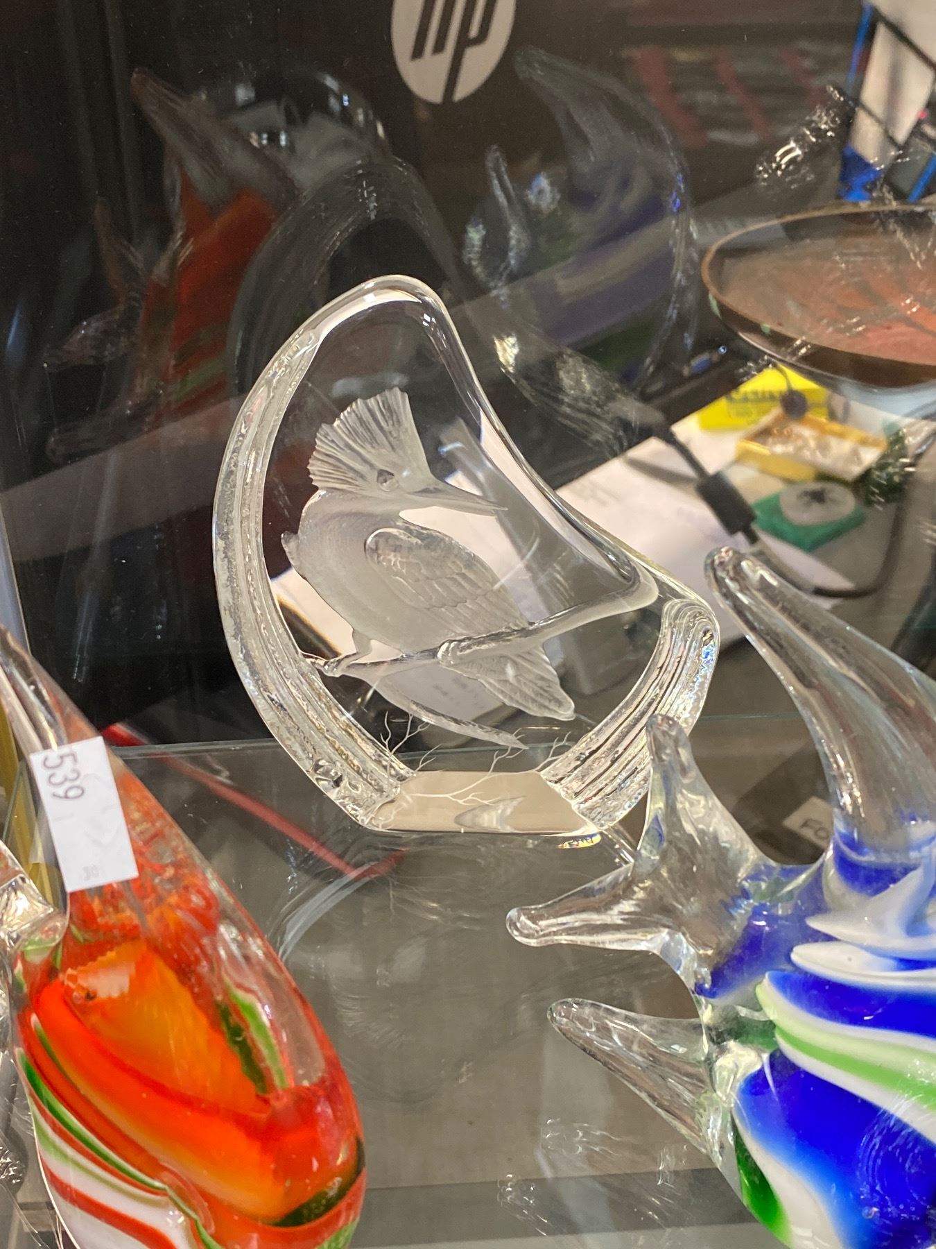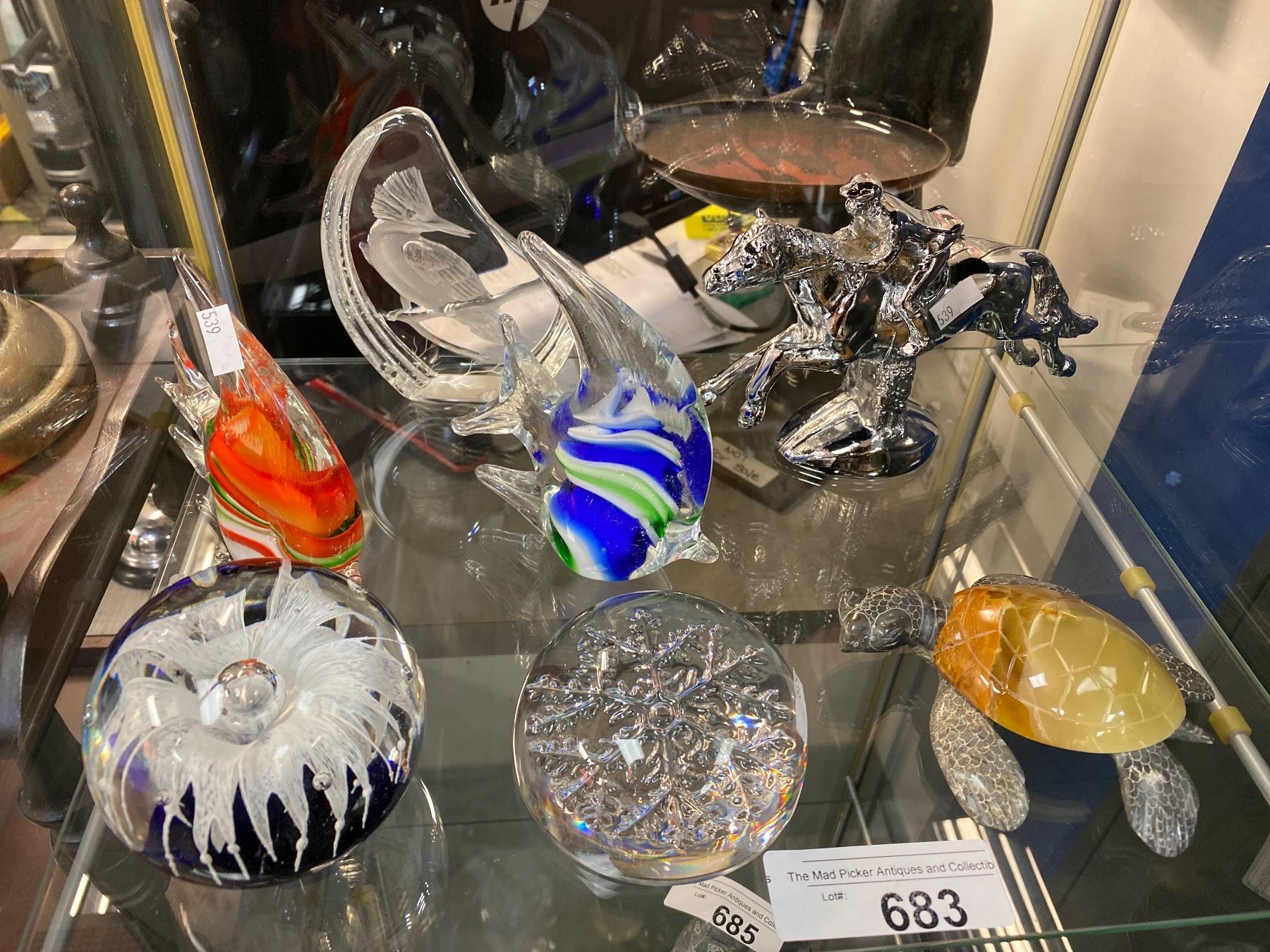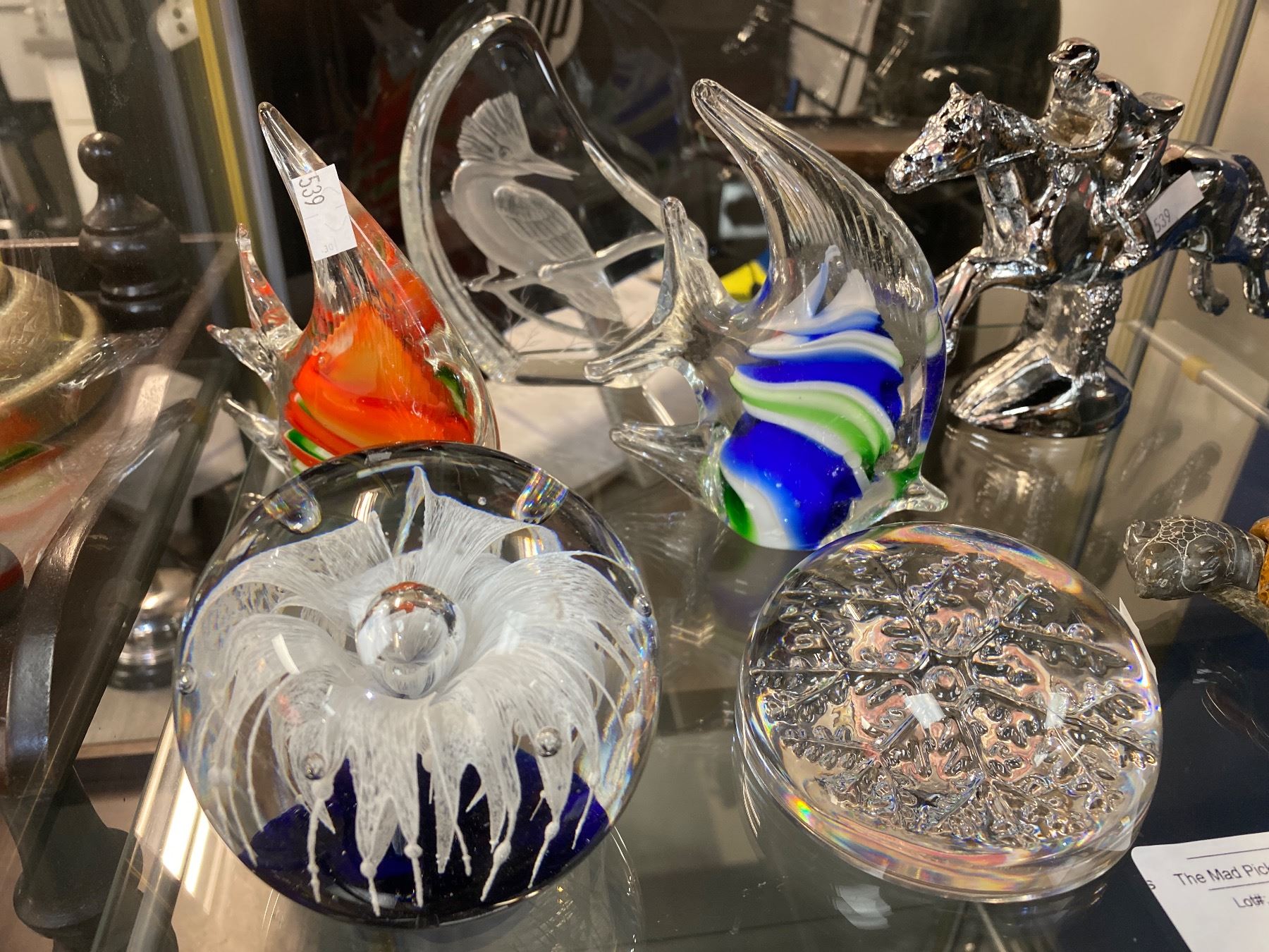 7 Assorted Collectibles, Glass Fish, Glass Paper Weights, Carved Stone Turtle, Etc..